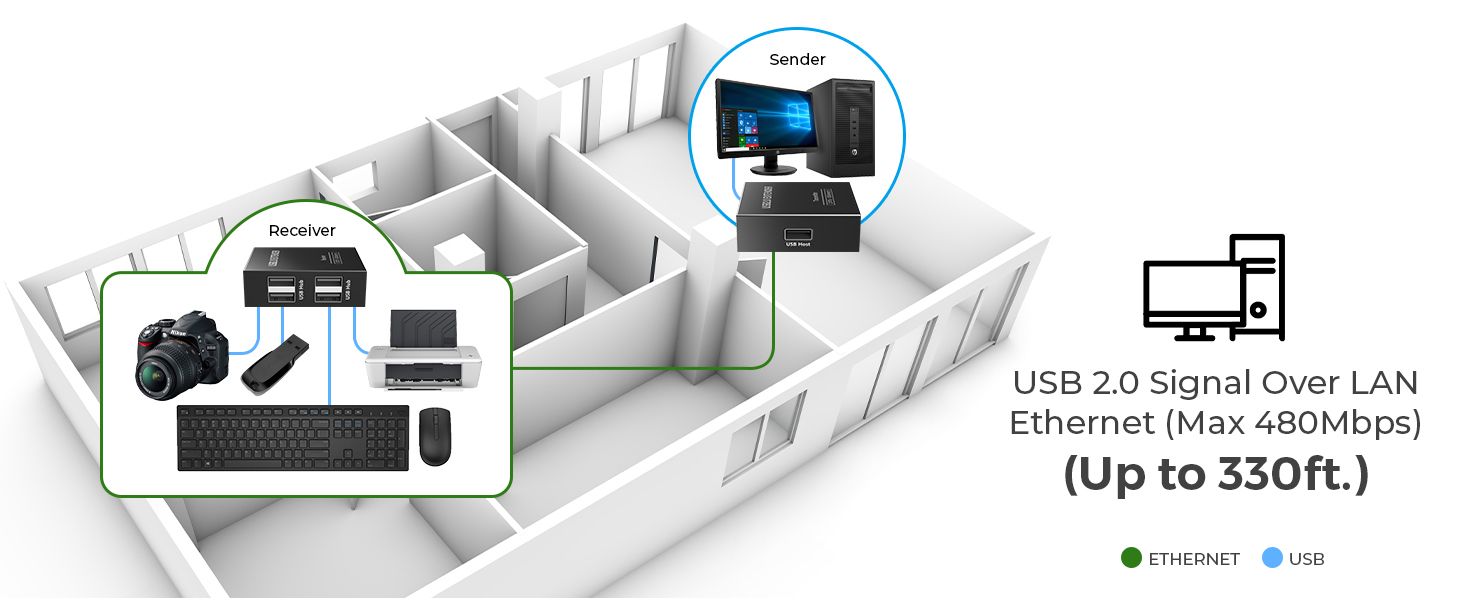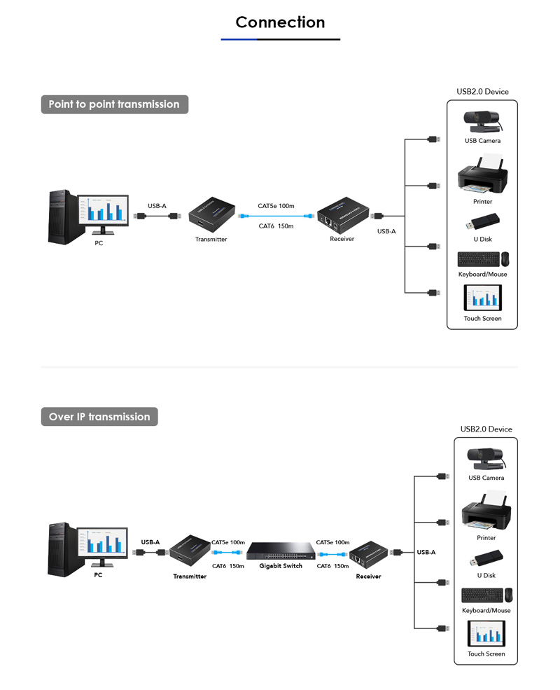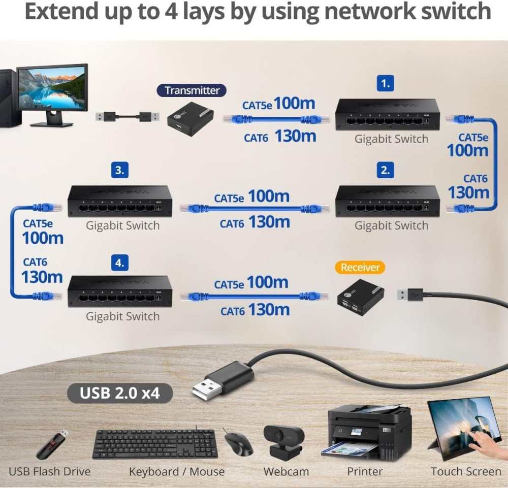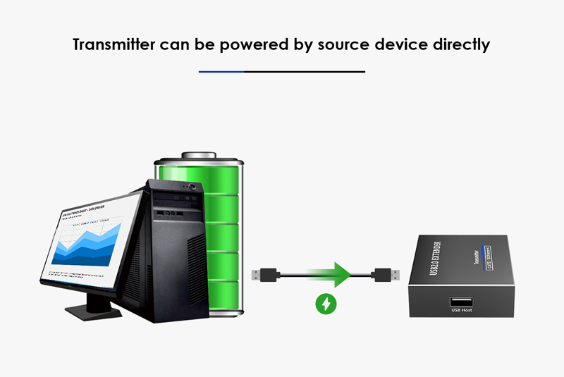 a umožňuje zapojit všechny USB periferie až do vzdálenosti až 150m. Pomocí levného kabelu Cat5/Cat5e/Cat6 se dosáhne ekonomického a efektivního řešení.