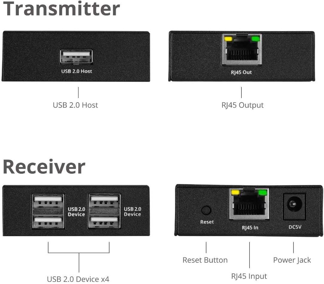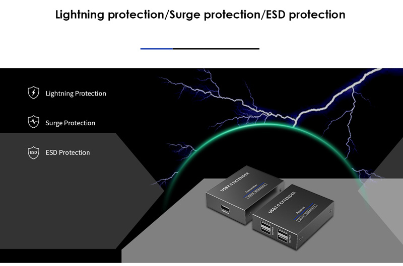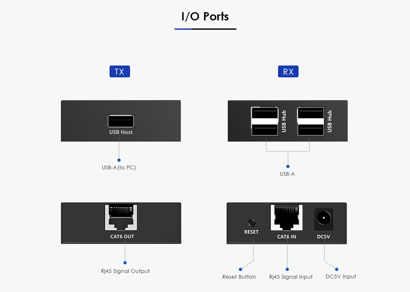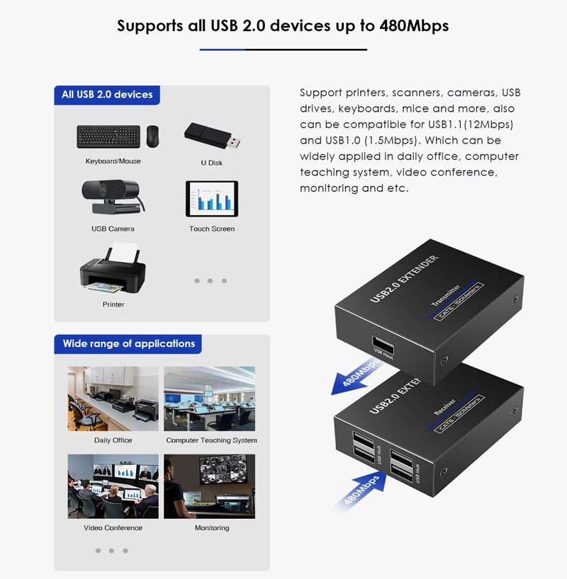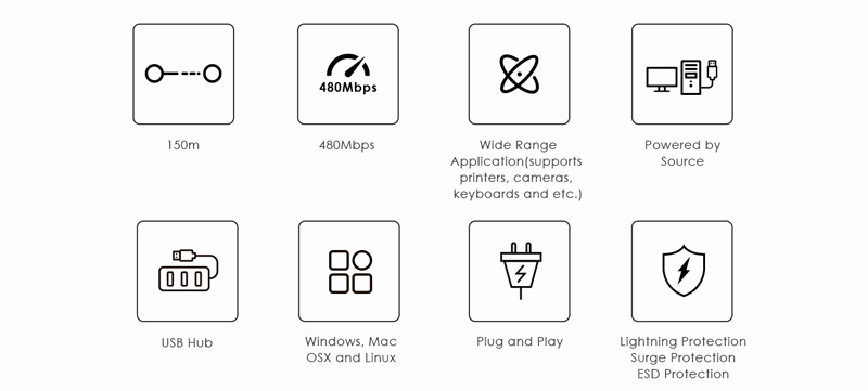- Podporuje zařízení USB 2.0 (rychlost 480Mbps) a je zpětně kompatibilní s USB 1.1 (low-speed, full speed) až do vzdálenosti 150m přes Cat 5/Cat5e/Cat6 kabely.