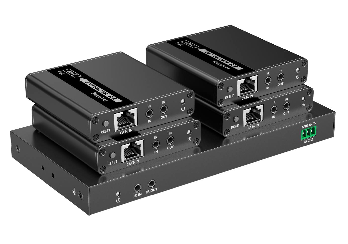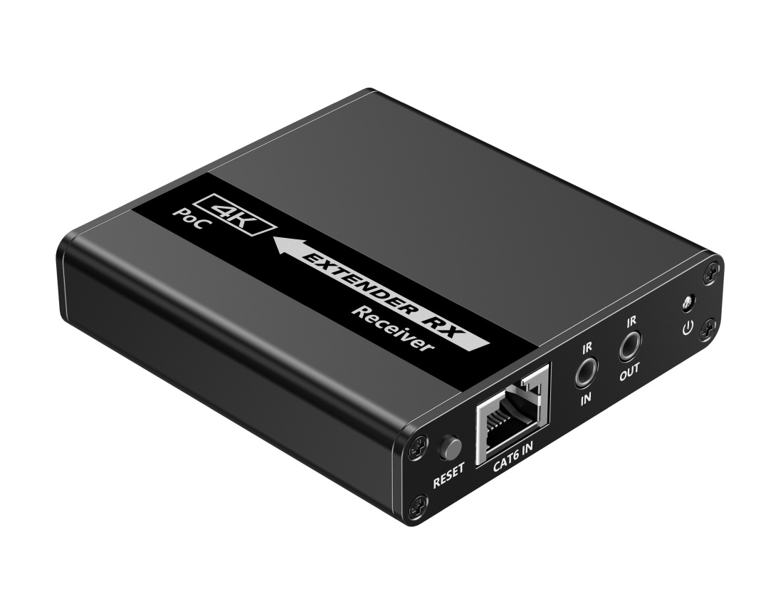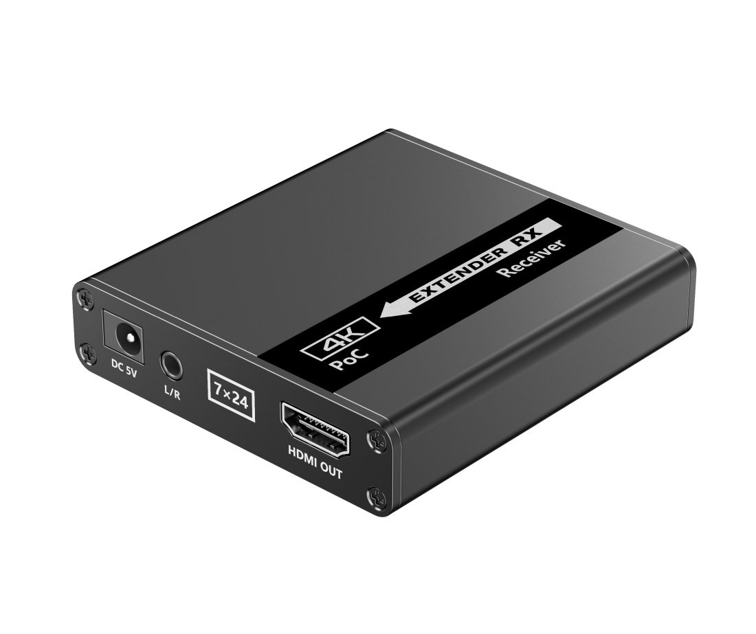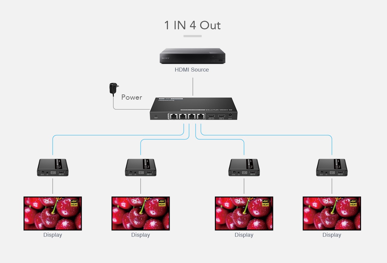 Extender se skládá z jedné vysílací jednotky s lokálním výstupem HDMI a čtyř přijímačů, které se propojí CAT6/6a/7 kabelem s vysílačem.