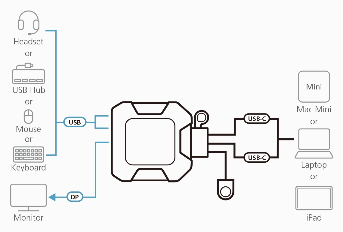USB a jeden výstupní port DisplayPort spolu s možností sdílení periferií USB. Díky externímu dálkovému voliči portů lze přepínací skříňku umístit kamkoli, aby byla pracovní stanice uklizená a zároveň umožňovala uživatelům okamžitě vyměňovat periferie mezi připojenými počítači a zajišťovat nepřerušovaný přenos dat z počítače.