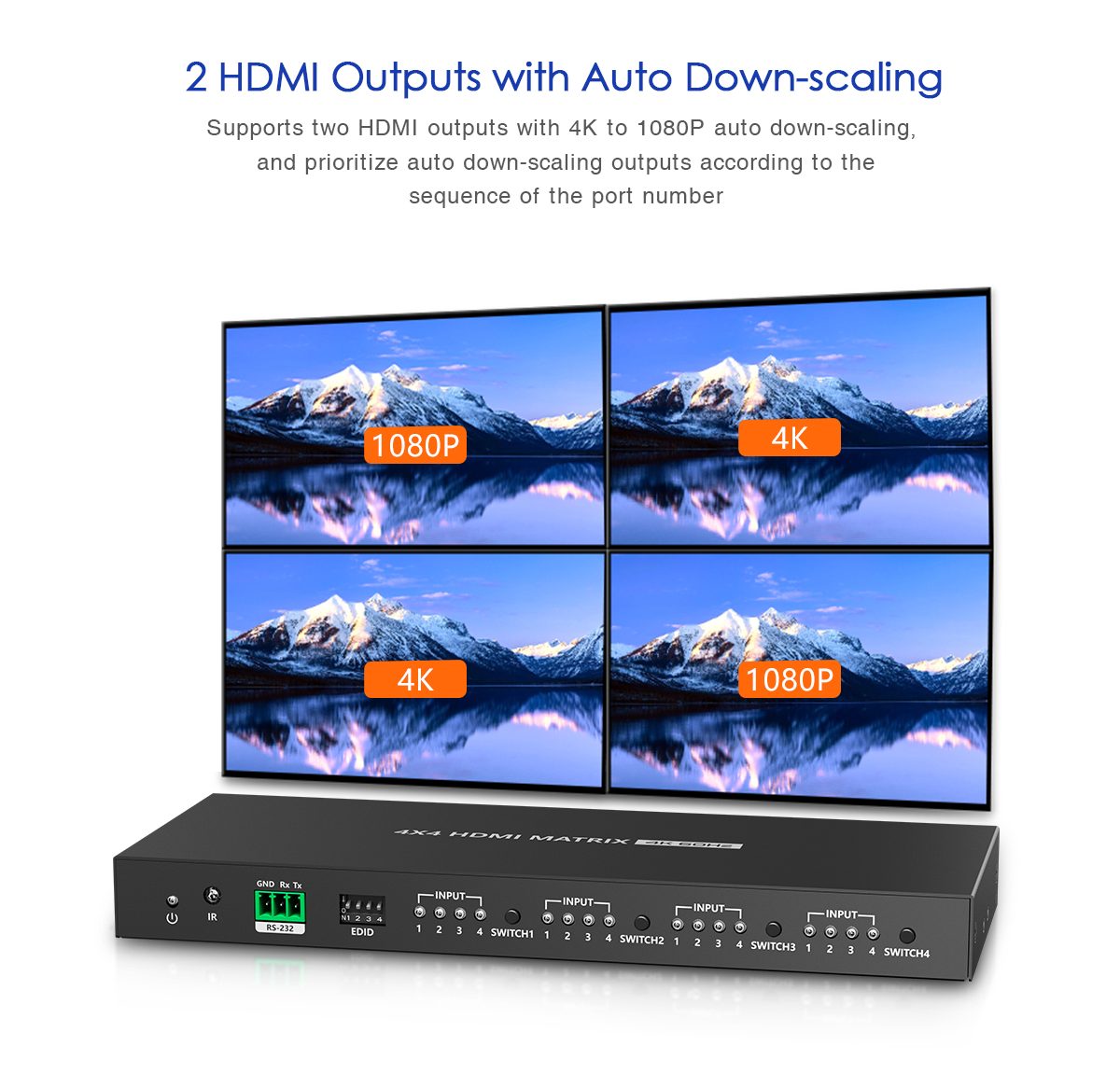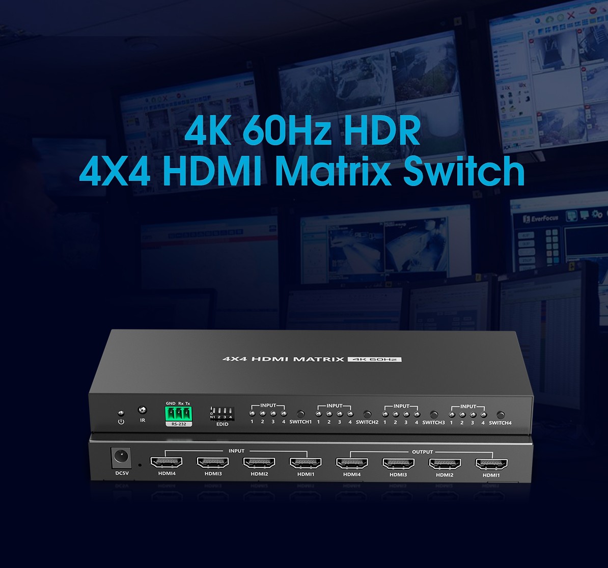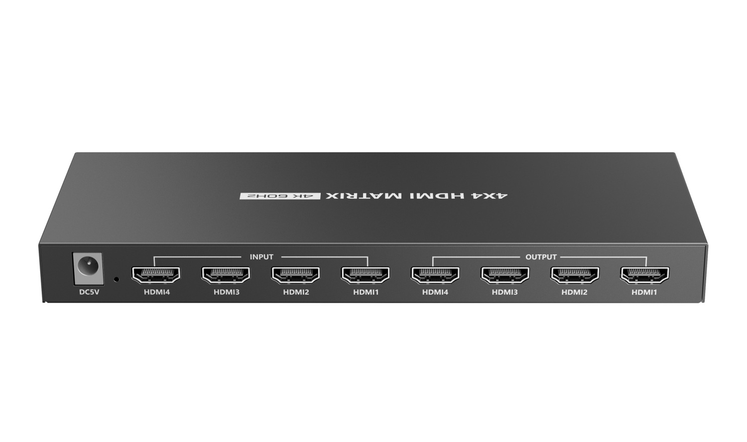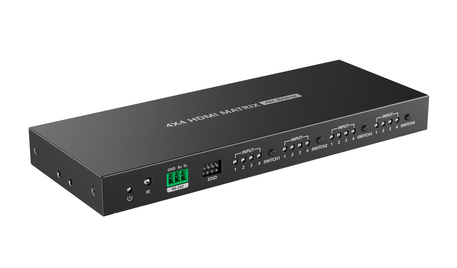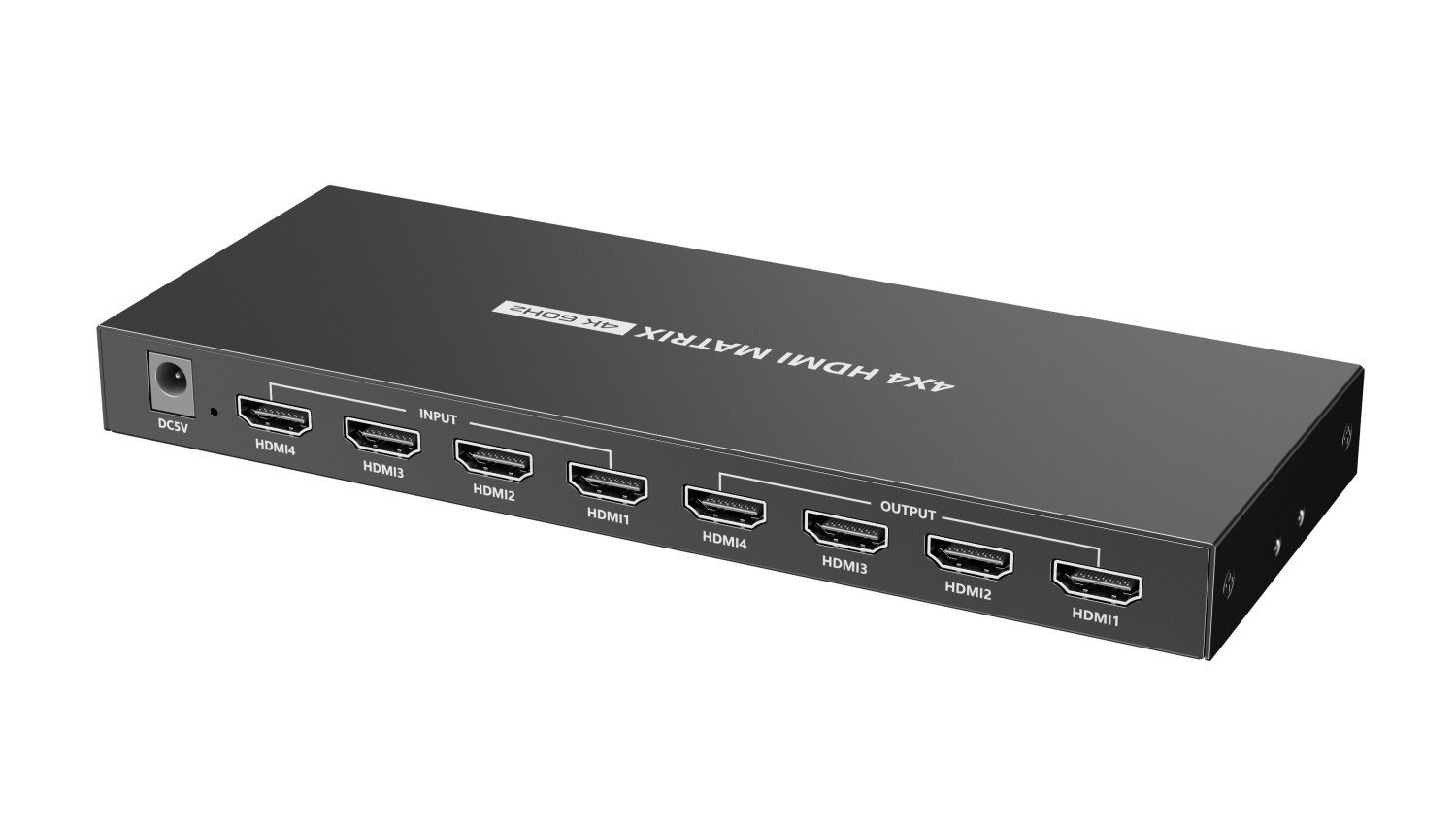 - Matrix provedení 4 vstupy a 4 výstupy, umožní připojit až 4 vstupy na 4 výstupy a libovolně přepínat.