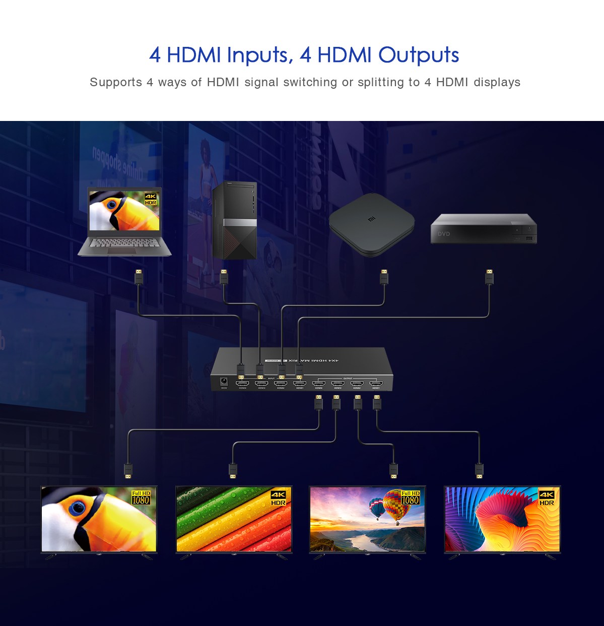 HDMI matrix switch 4:4, umožní propojit až čtyři zdroje signálu HDMI na 4 výstupy HDMI, umožní zapojit například PC+DVD přehrávač+BlueRay k jednomu vybranému monitoru ze čtyřech.