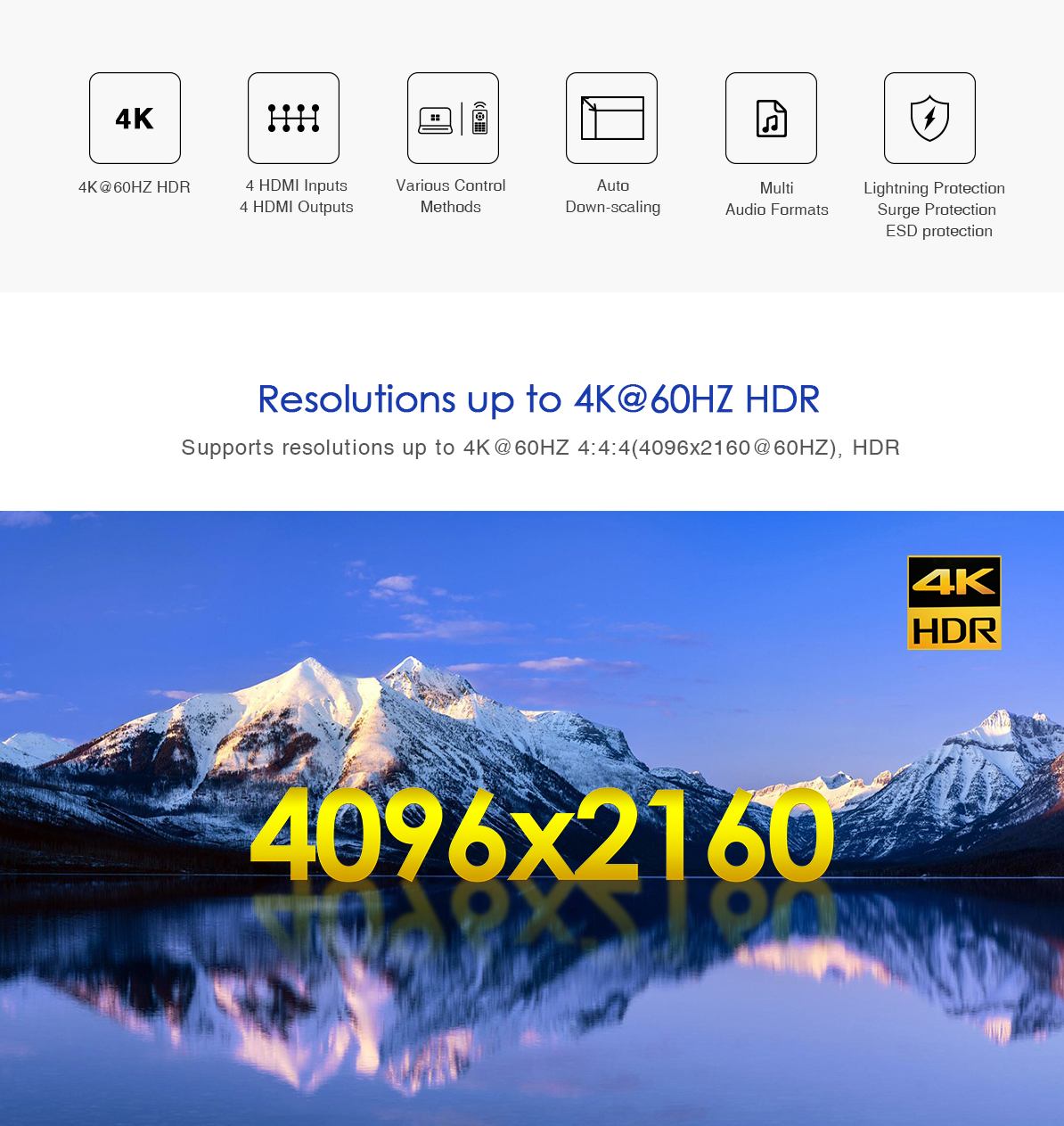 - Všechny podporované rozlišení: 480i@60Hz, 480p@60Hz, 576i@50Hz, 576p@50Hz,720p@50/60Hz, 1080i@50/60Hz, 1080p@50/60Hz,3840×2160@24/25/30/60Hz, 4096×2160@24/25/30/60Hz