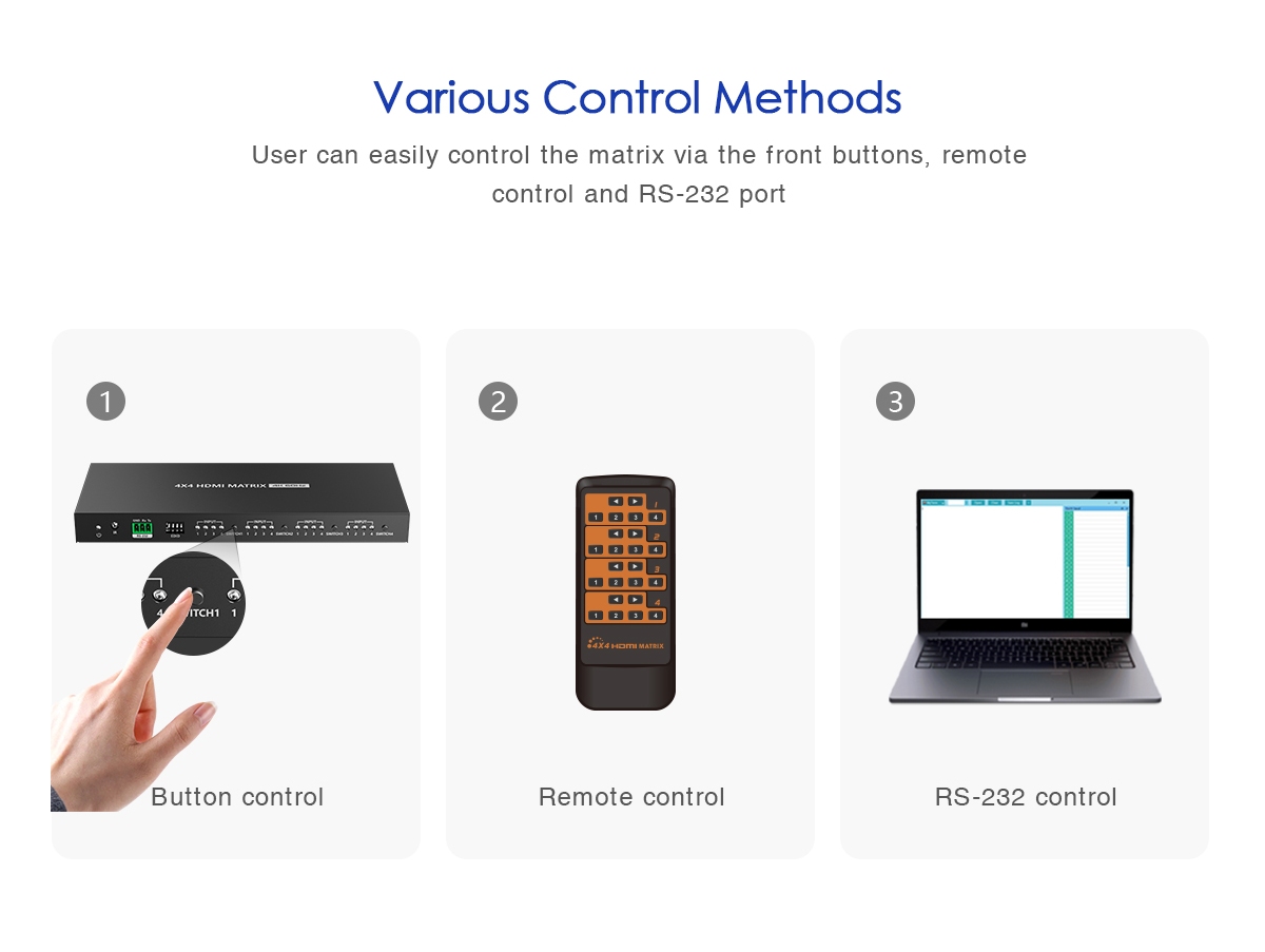 Ovládání pomocí dálkového ovladače nebo čtyřmi tlačítky na předním panelu přepínači, je možné nastavit libovolný vstup na jeden ze čtyř výstupů. Přepnutí je ihned signalizováno LED diodami, které představují číslo vstupu, který je aktuálně přepnut na výstup.
