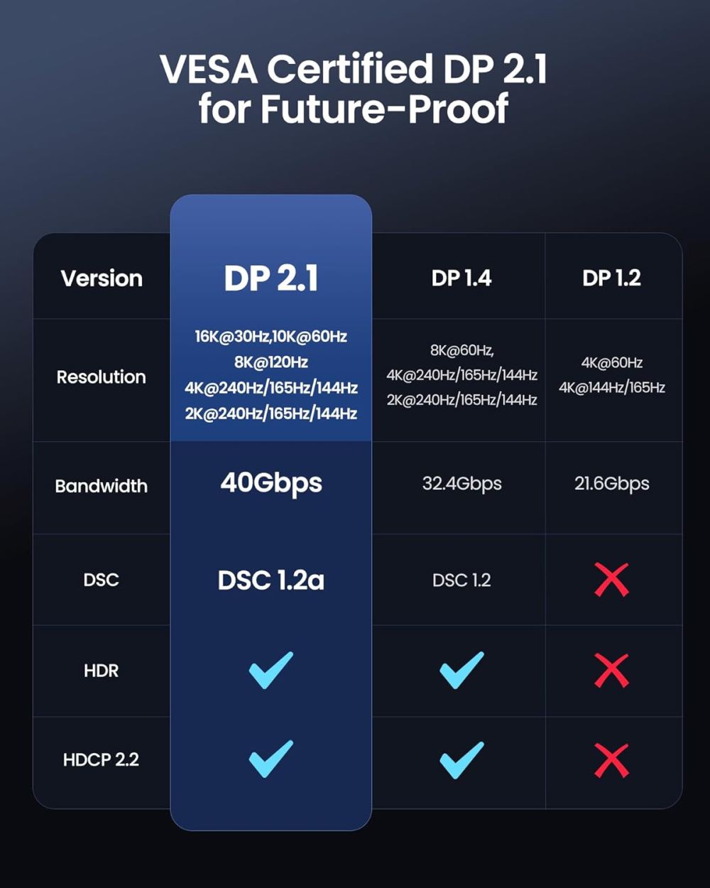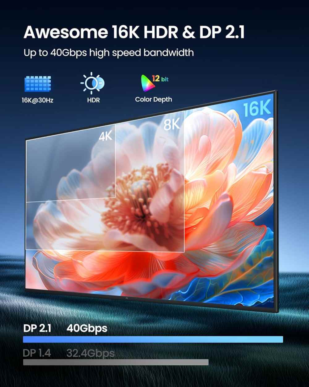 Adaptér s nejnovější specifikací DP1.4 přichází, podporuje rozlišení až 8K@60 Hz s HDCP 2.2, umožňuje připojit a zobrazovat na nejnovějších monitorech nebo televizorech v rozlišení ultra HD 8K@60Hz
