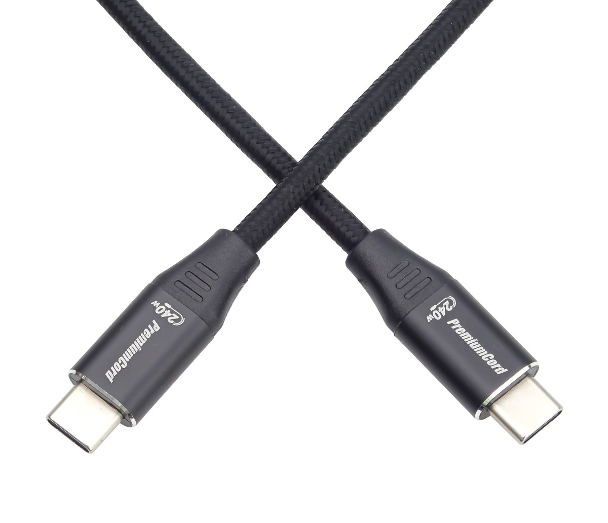 PremiumCord Kabel USB-C male - USB-C male, hliníkové krytky konektorů, bavlněný oplet, speciálně navržený kabel pro rychlé a výkonné nabíjení nebo napájení přes USB-C, nabíjení až do výkonu 240W, přenosová rychlost: 480Mbps