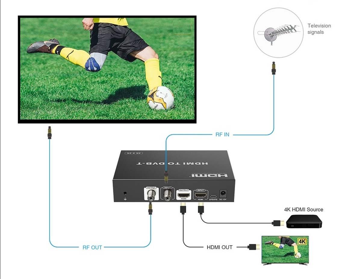 PremiumCord 4K HDMI modulátor na DVB-T, slouží k převodu nekomprimovaného obrazového a zvukového signálu v digitálním formátu připojeného na rozhraní HDMI na komprimovaný video signál MPEG-2 4Kx2K (H.265) a FULL HD (H.264) a jeho modulaci na DVB-T kanál