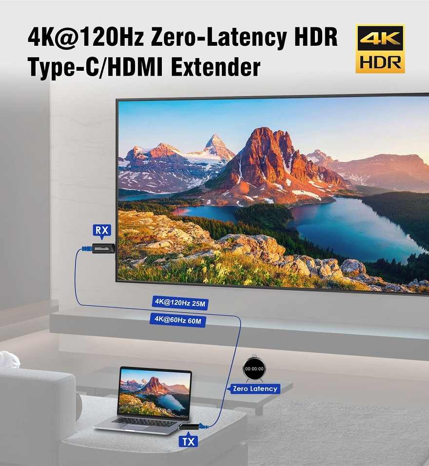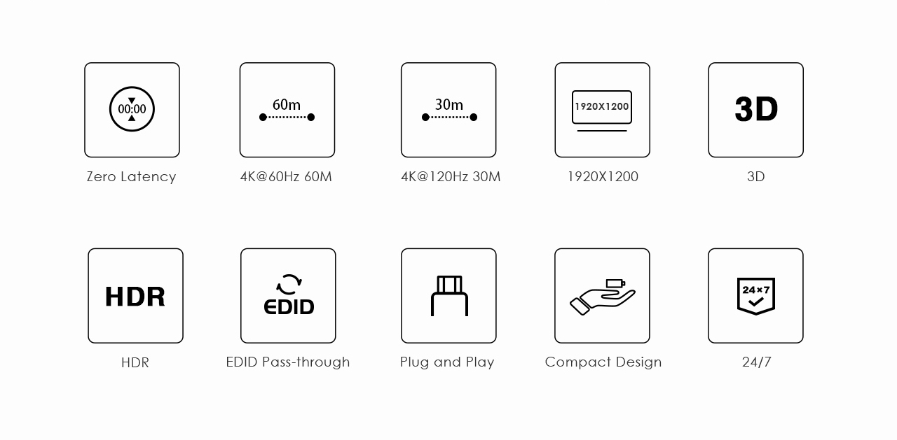 - Podporuje 4K@60Hz na 60m a 4K@120Hz na 30m a FULL HD 1080p až na 60m při použití kvalitního UTP kabelu CAT6 s měděnými vodiči AWG23