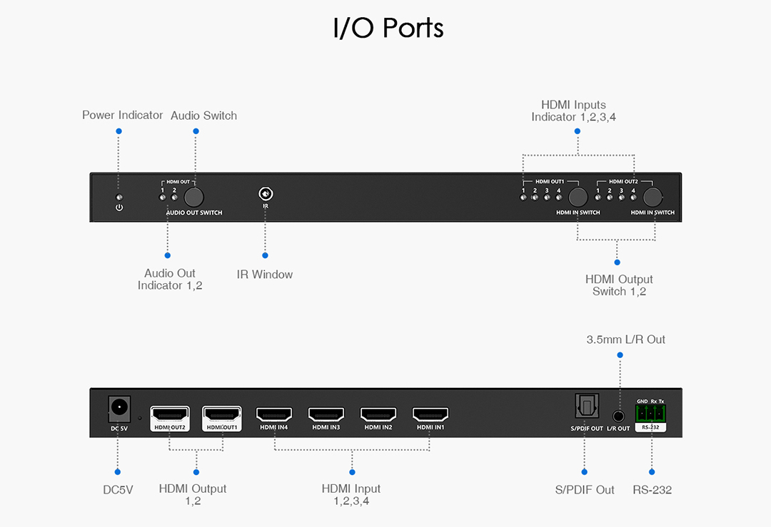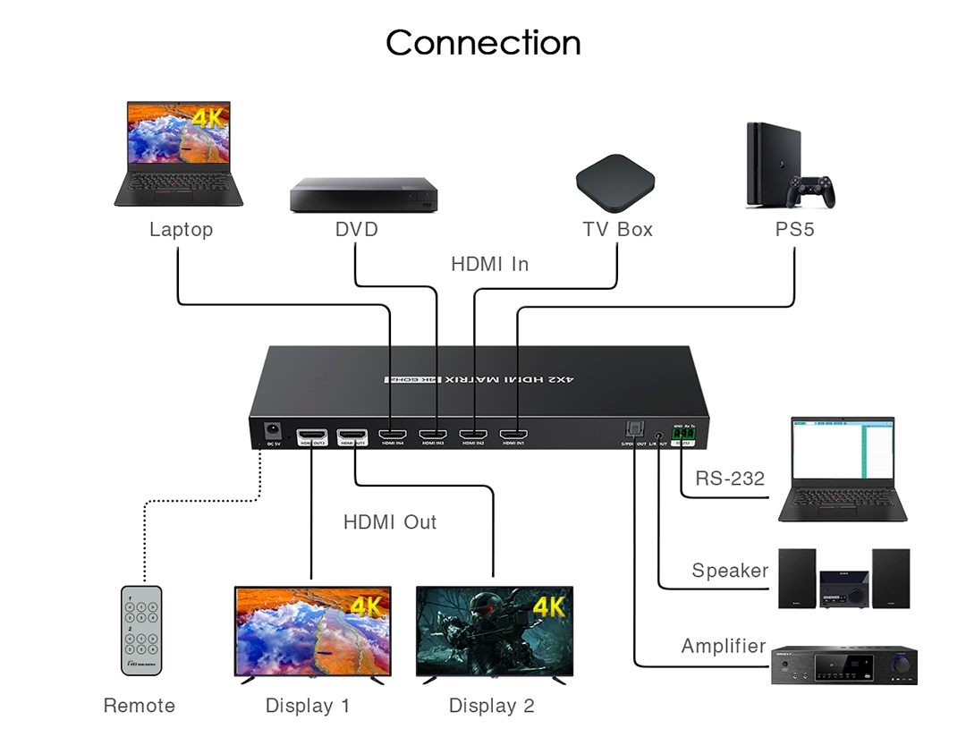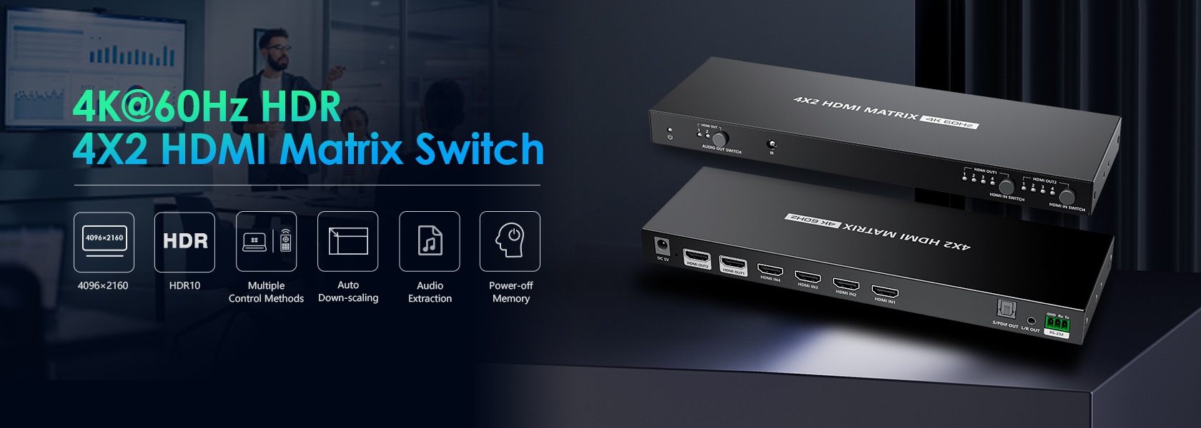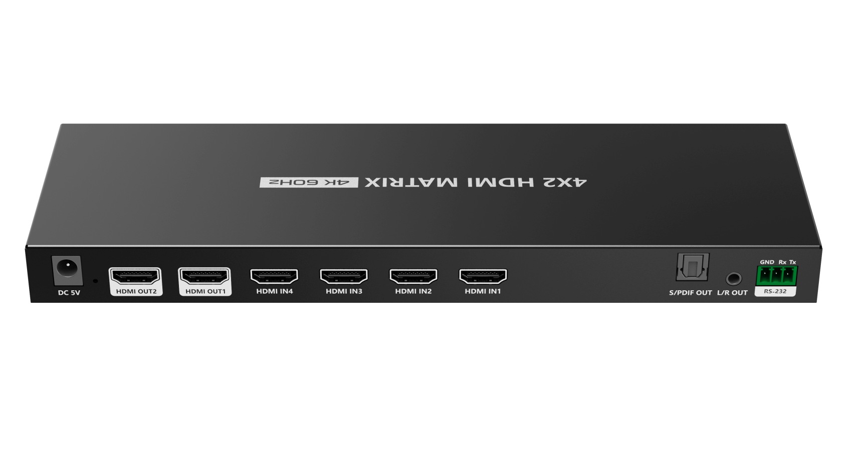 Umožní propojit více zdrojů signálu, 4 vstupy HDMI na 2 výstupy HDMI.
