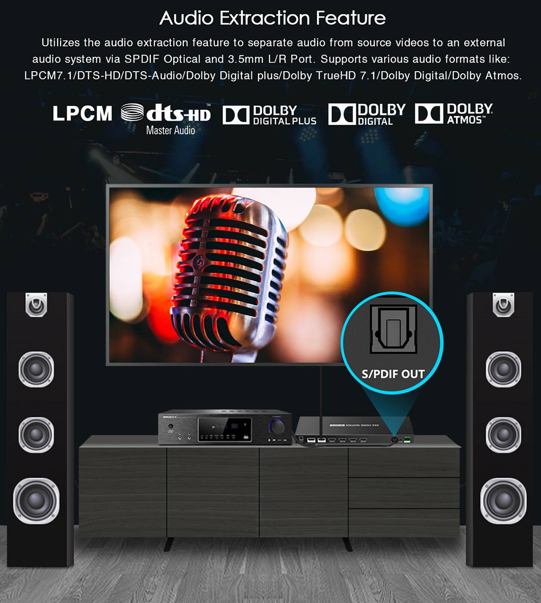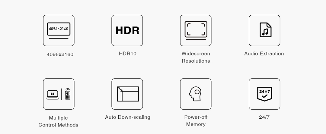 - Také podporuje rozlišení: 480p, 576p, 720p, 1080i, 1080p, 3840x2160@24/25/30/50/60Hz, 4096x2160@24/25/30/50/60Hz