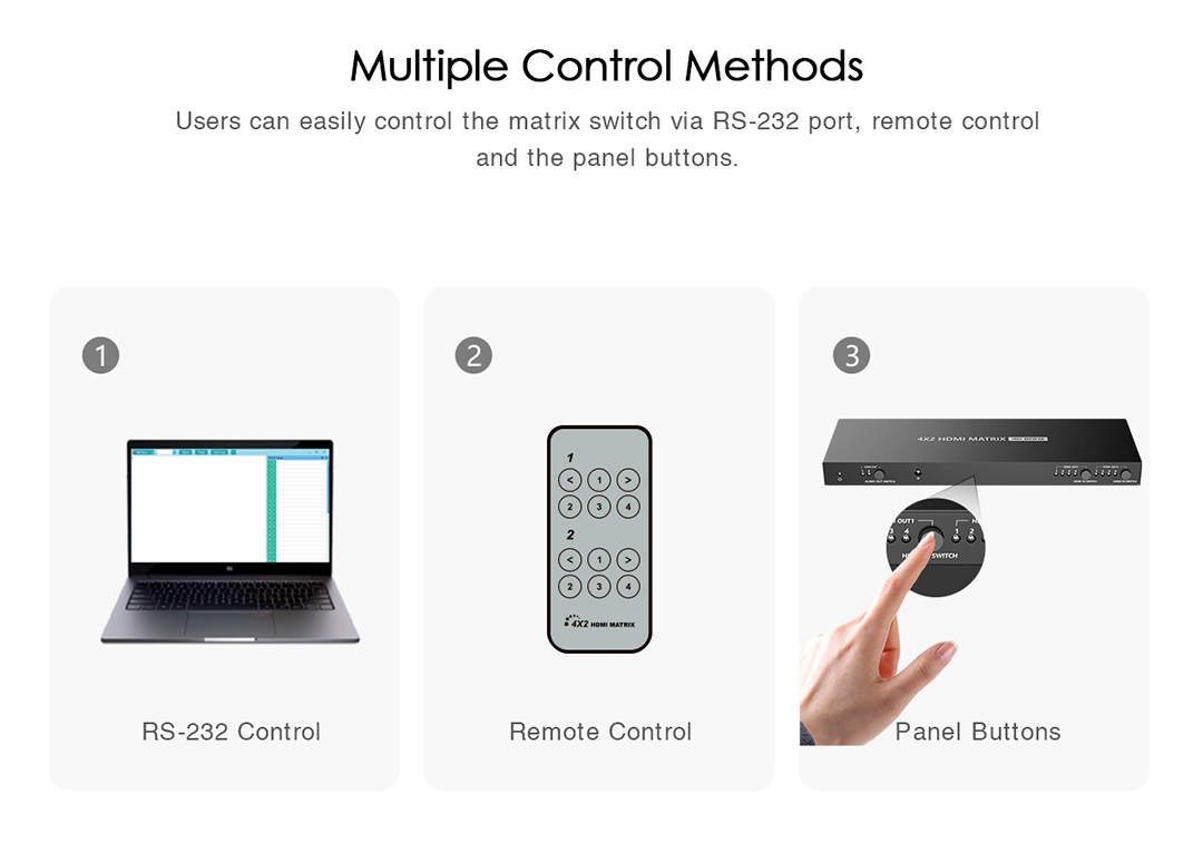 Ovládání pomocí dálkového ovladače nebo dvou tlačítek na přepínači, je možné nastavit libovolný vstup na jeden z dvou výstupů. Ovládání pomocí RS232.
