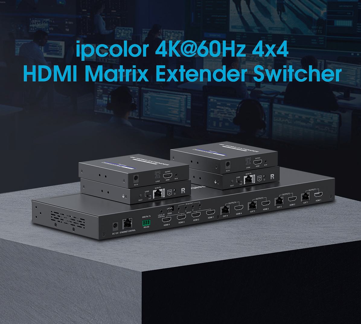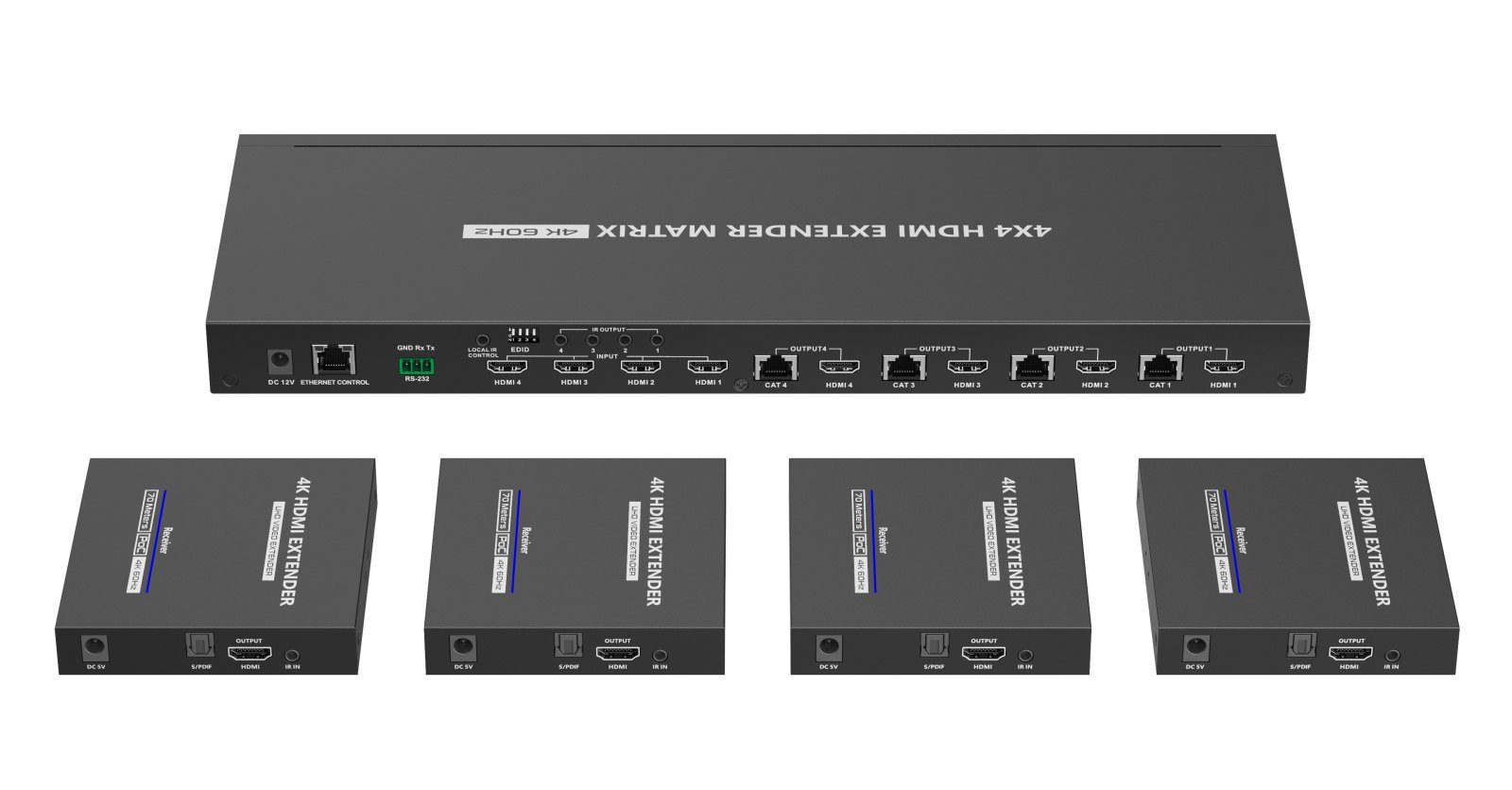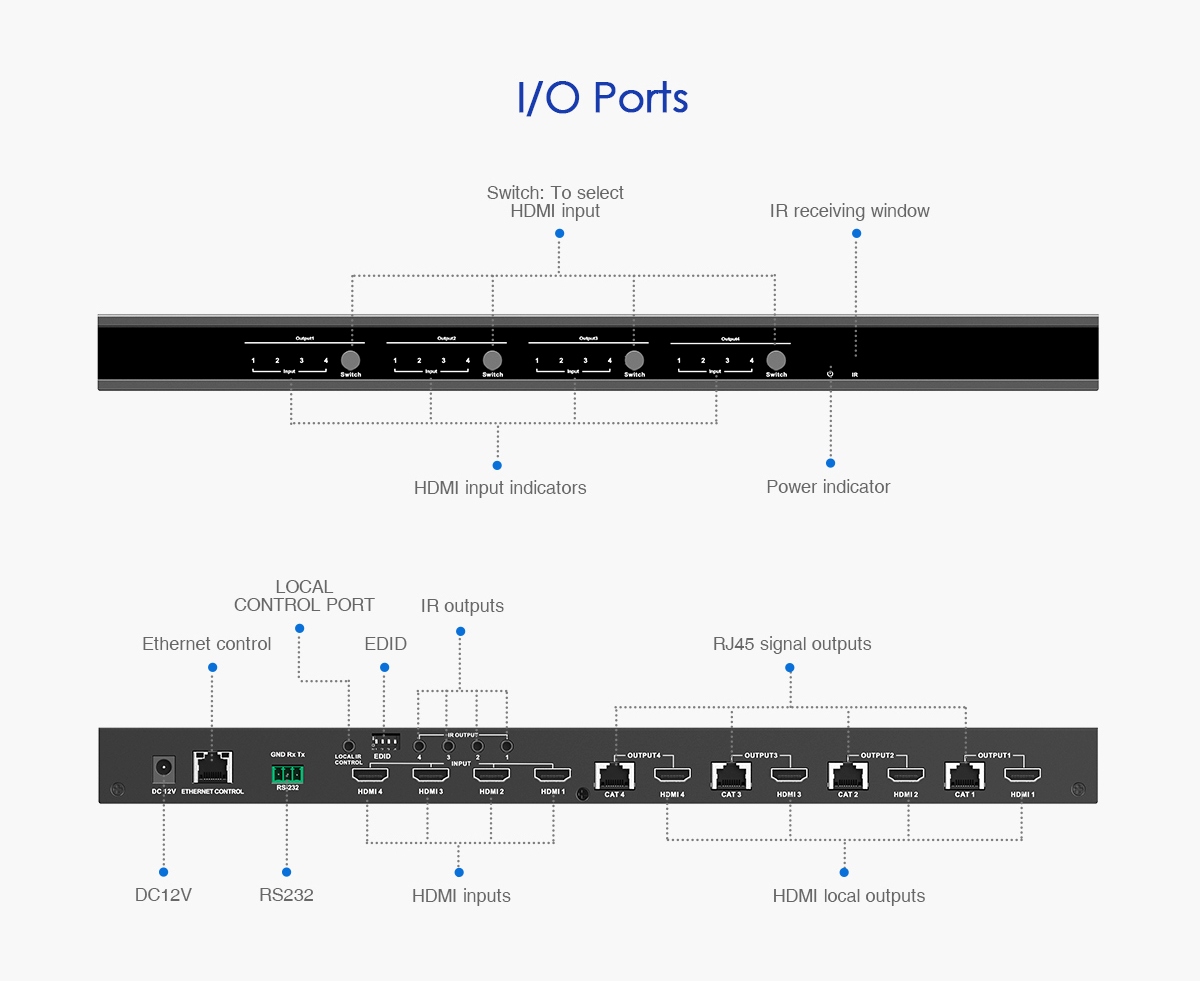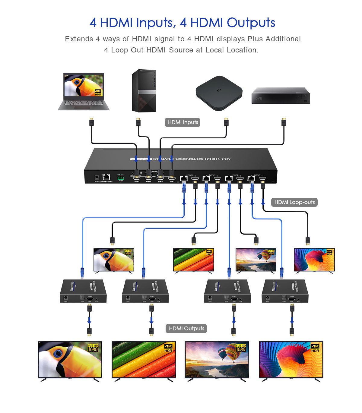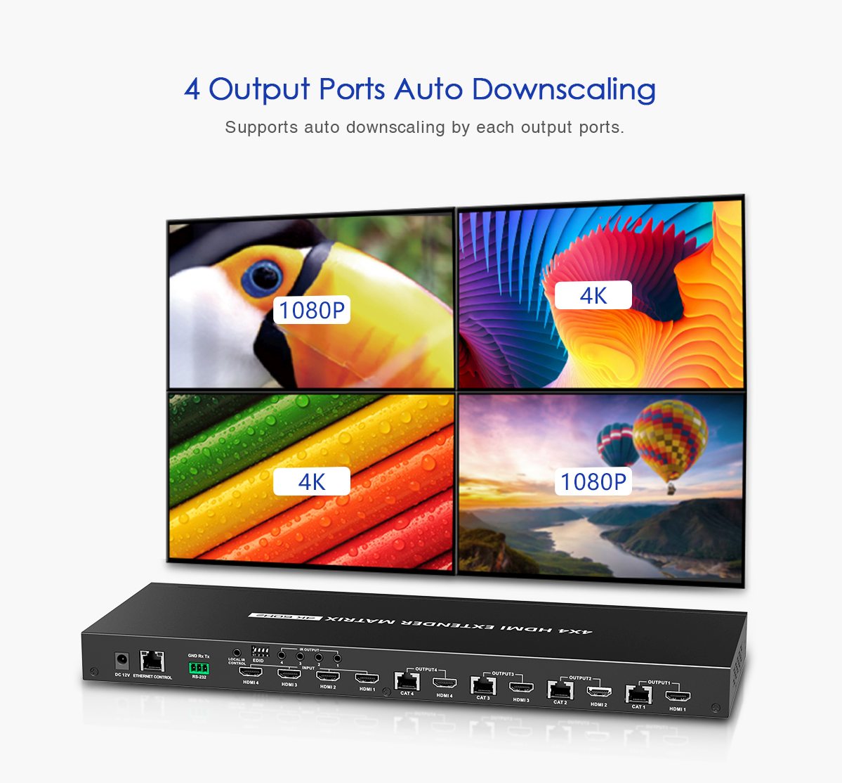 Umožní přepínat a propojit čtyři zdroje HDMI signálu na 4 HDMI zobrazovače, monitory na velkou vzdálenost až 70m pomocí UTP kabelu a navíc 4 lokální monitory