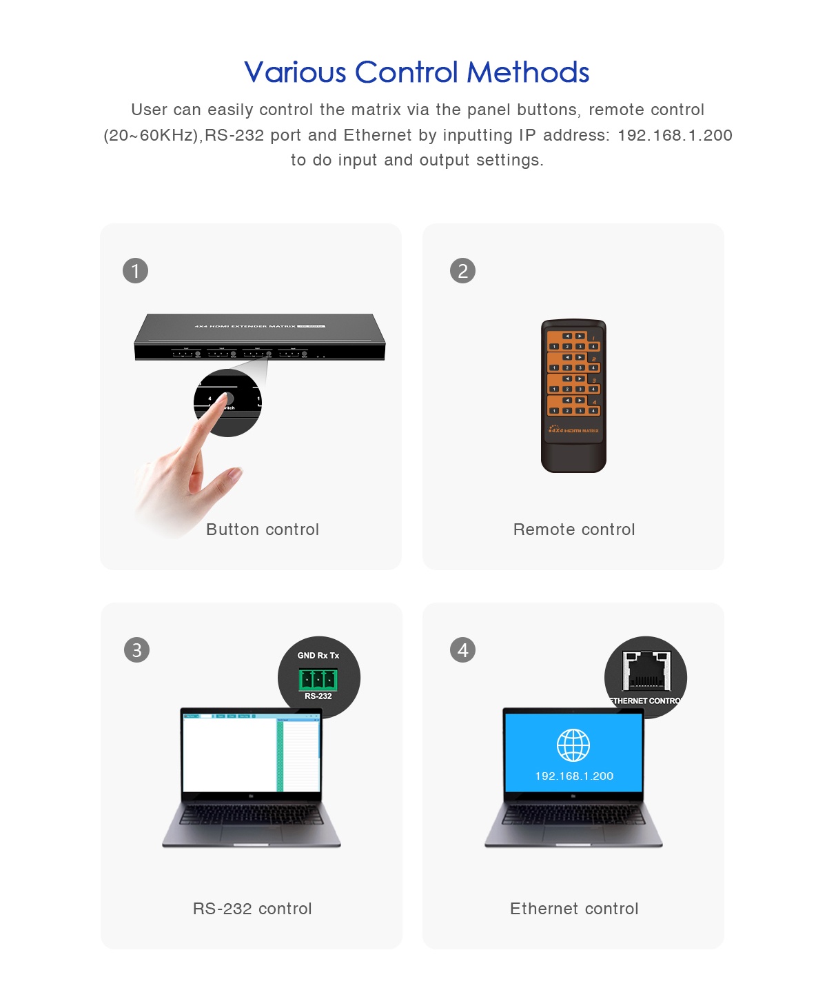 - Matrix provedení 4 vstupy a 4 výstupy vzdálené až 70m a 4 výstupy lokální, umožní připojit až 4 vstupy na 4 výstupy vzdálené + 4 lokální a libovolně přepínat.