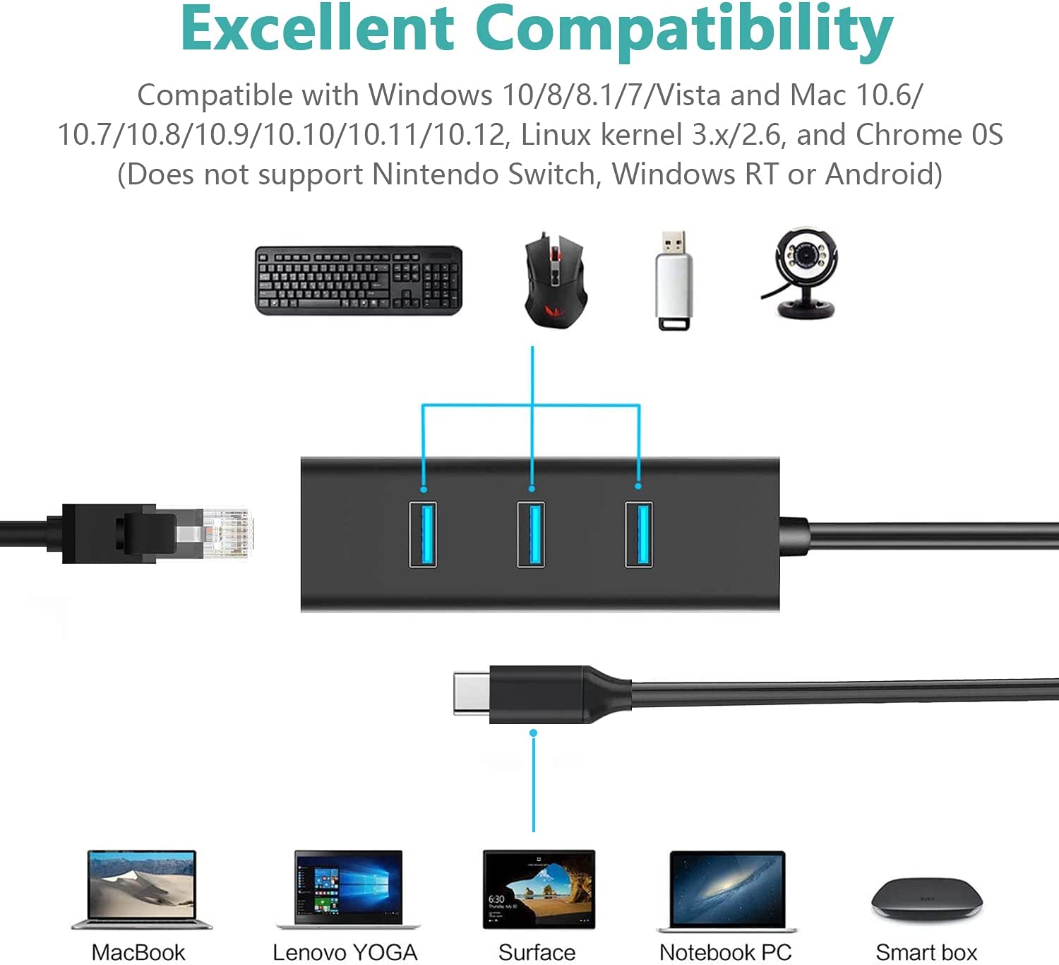 Převodník, který umožní připojit Váš počítač s portem USB typu C do internetu nebo k lokální síti pomocí kabelu s RJ45 a navíc umožňuje zapojit tři USB3.2 periferie jako USB disk, tiskárnu, klávesnici a myš