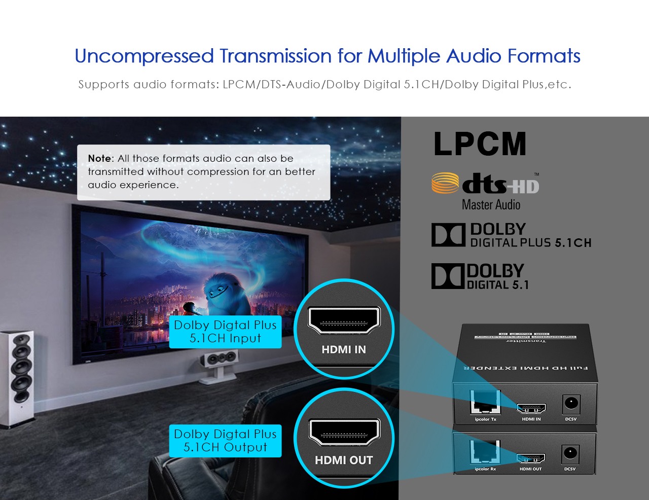 - Podporuje FULL HD 1080p až na 150m při použití kvalitní sítě Cat6/6A/7, HDMI1.4
