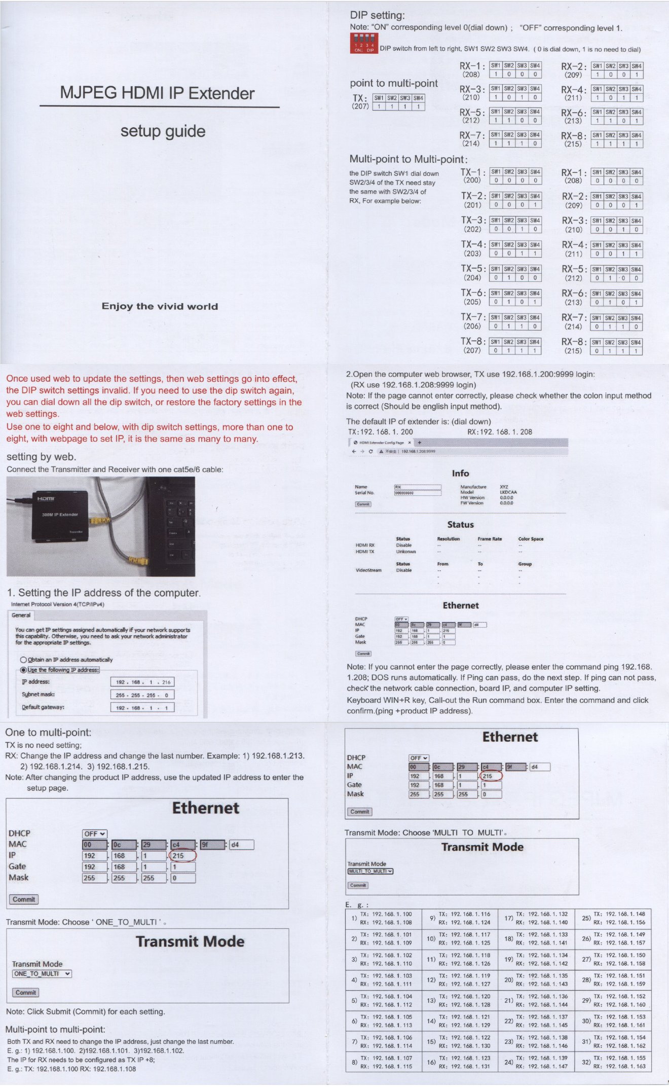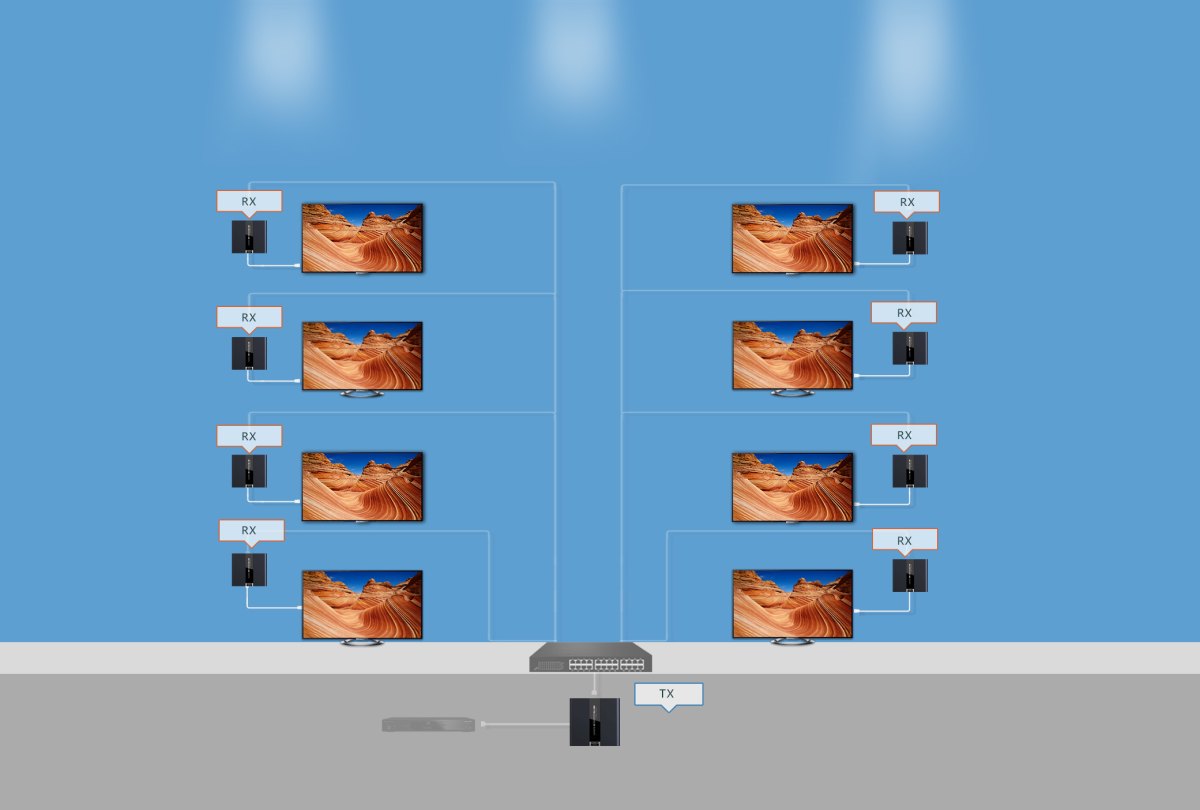 - Extender umožňuje použití jednoho vysílače a více přijímačů vzájemně propojených pomocí LAN sítě, switchů a routerů, tato počítačová síť musí být vyhrazena pouze pro HDMI extendery, nesmí sdílet další počítače, tiskárny a jiná síťová zařízení.