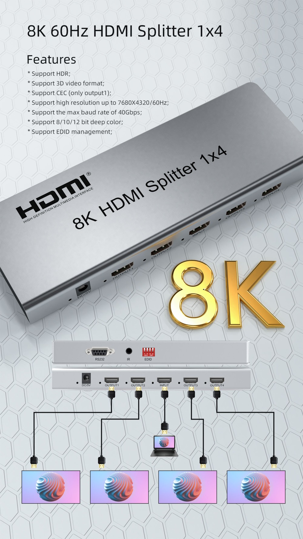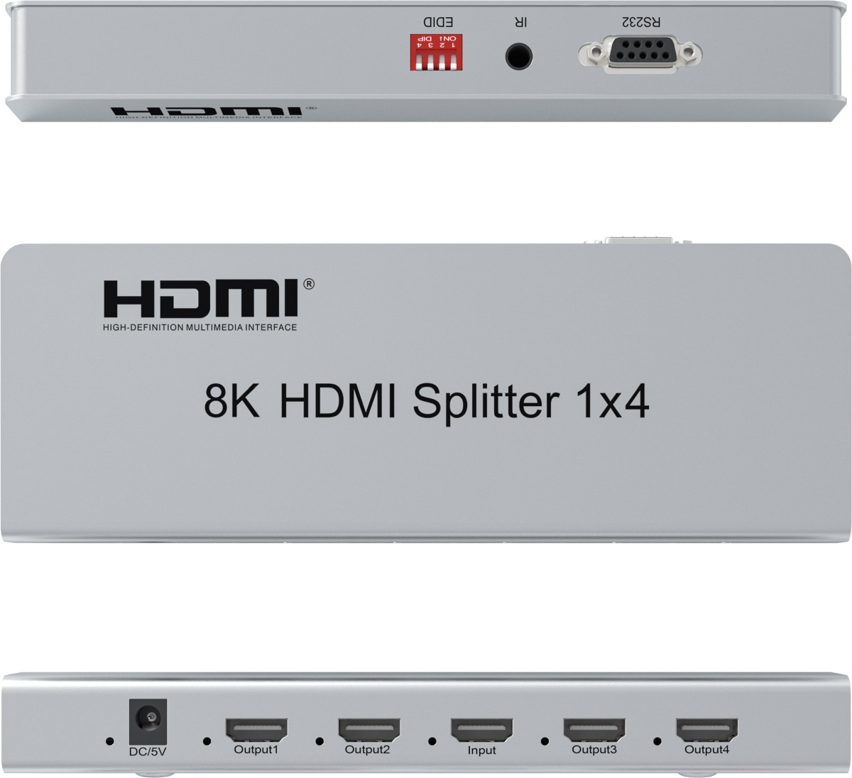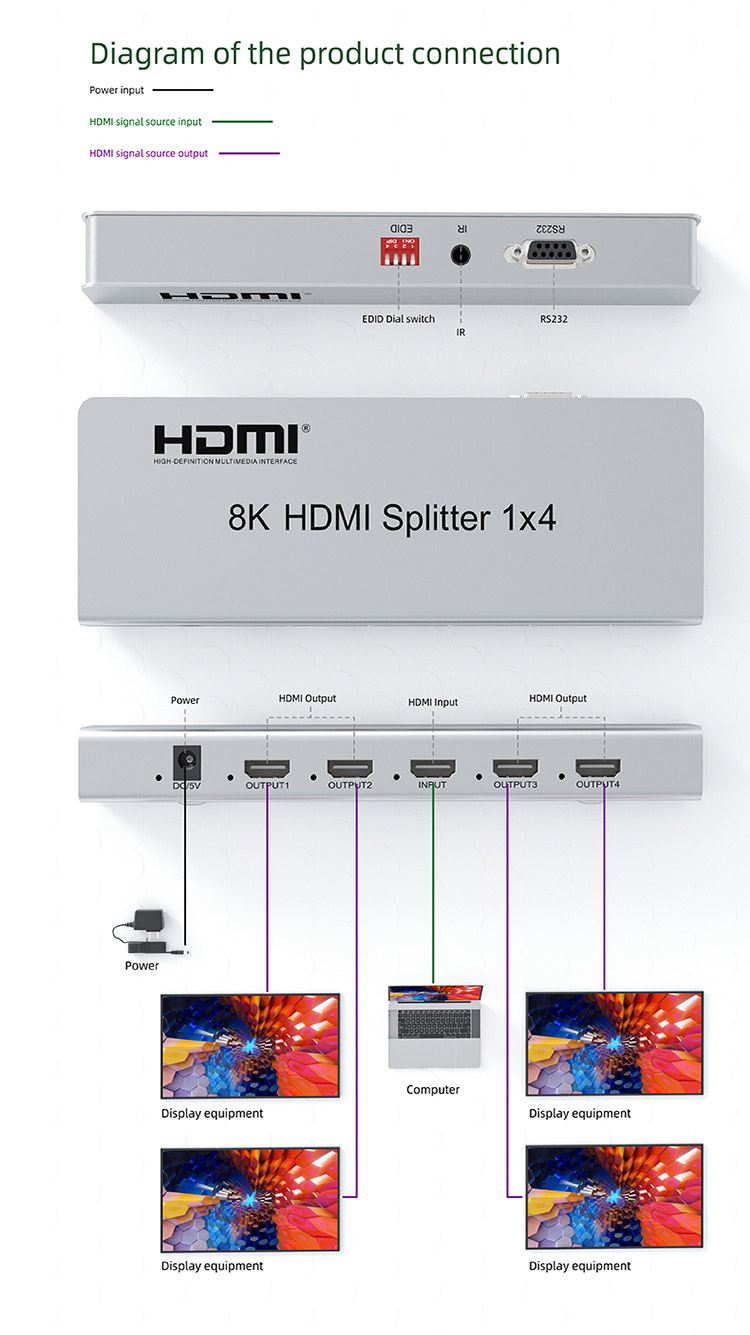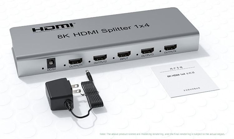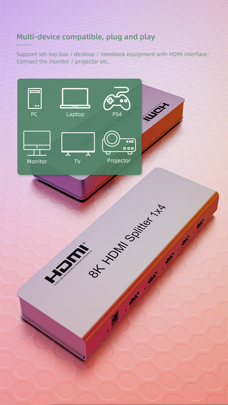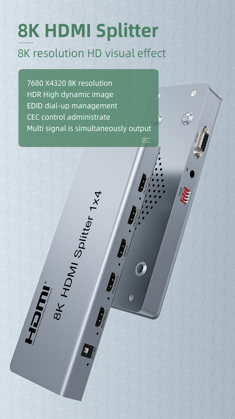 HDMI 2.1 splitter 1-4 porty, 8K@60Hz, 4K@120Hz, 1080p, HDR+ zapojí čtyři HDMI obrazovky k jednomu HDMI zdroji signálu jako je PC, notebook, DVD, set top box, EDID down-scaling umožňuje připojit na výstupu monitory s rozlišením 8K, 4K nebo 1080p