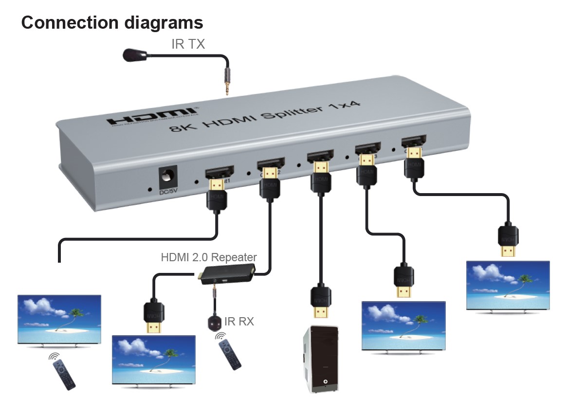 Můžete připojit až čtyři HDMI obrazovky k jednomu HDMI zdroji signálu jako je PC, notebook, DVD, set top box, atd.
