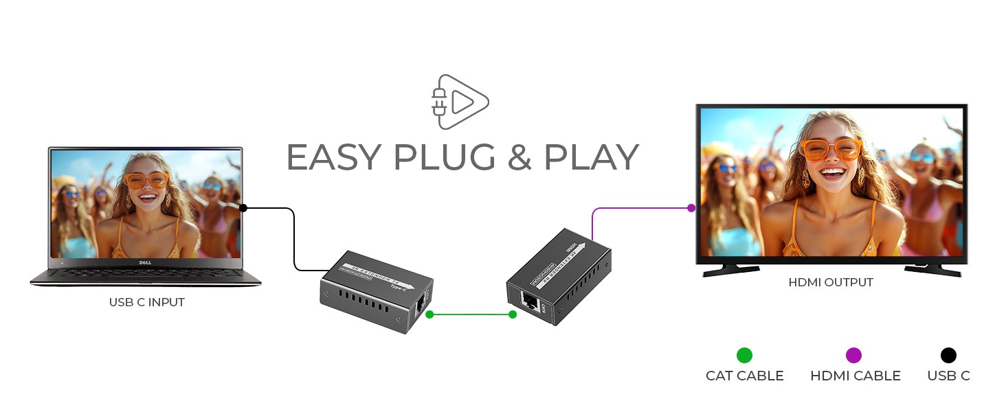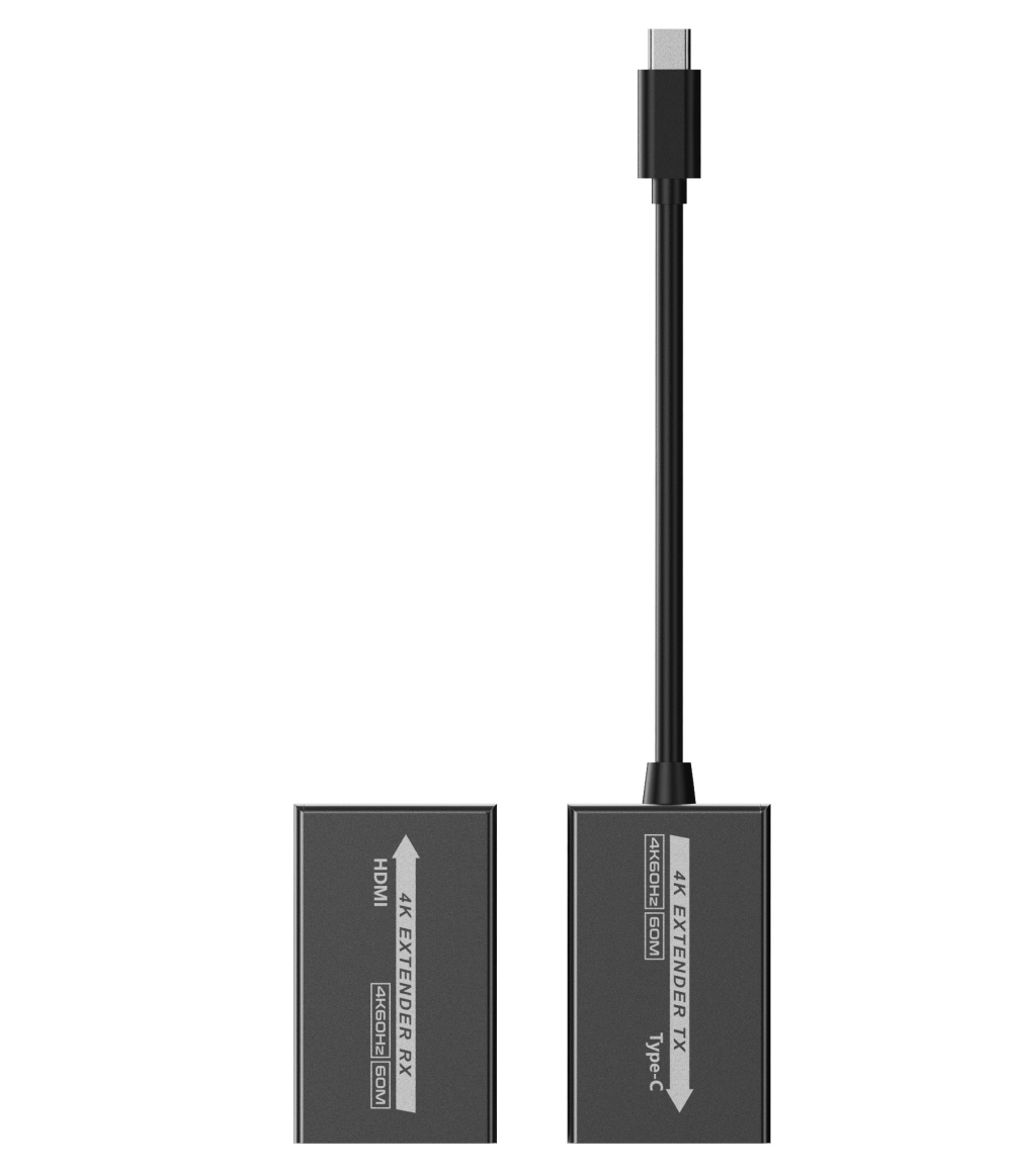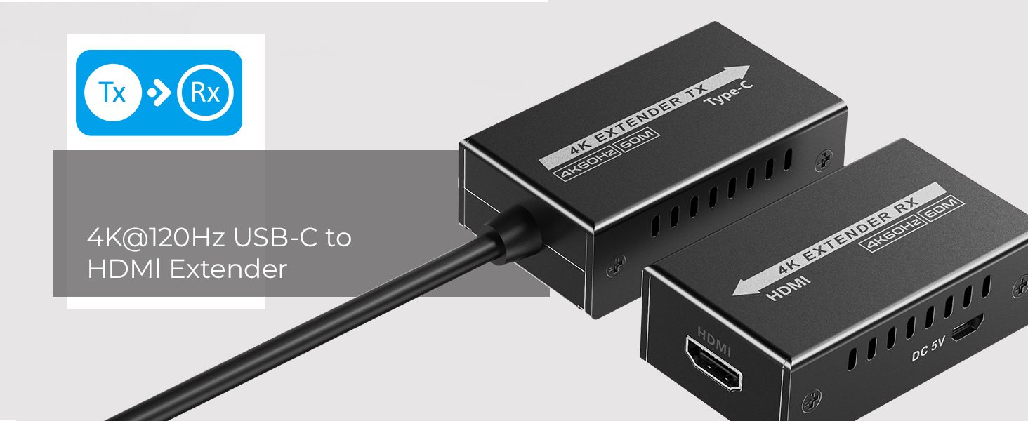- Sestava se skládá z vysílače TX a přijímače RX, které se propojí kvalitním patch kabelem Cat5e/6/6a. Vysílací zařízení s USB-C konektorem zobrazuje špičkový obraz na HDMI projektoru, monitoru na velkou vzdálenost.