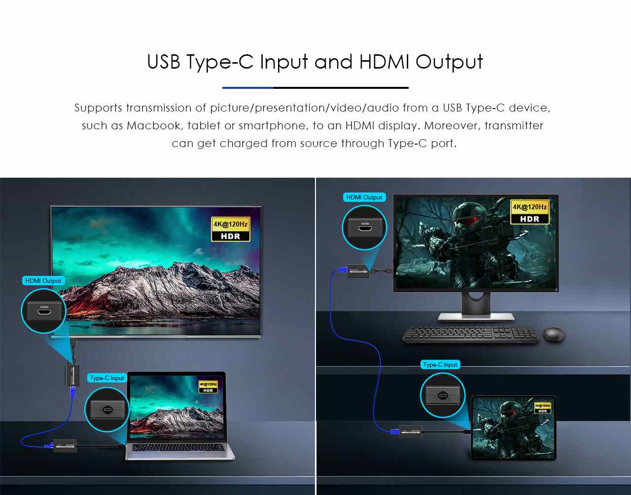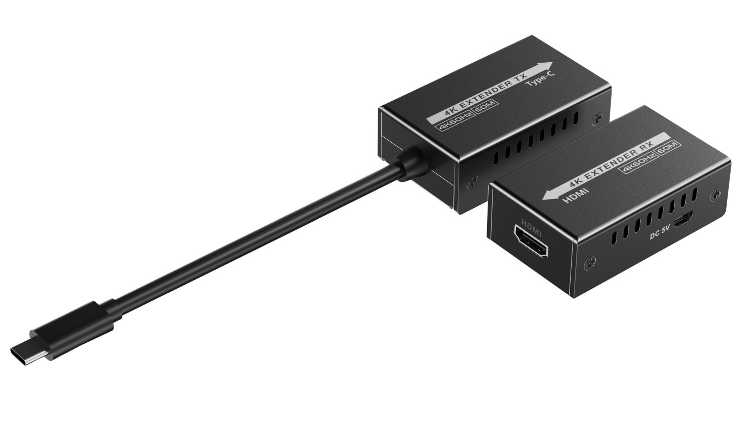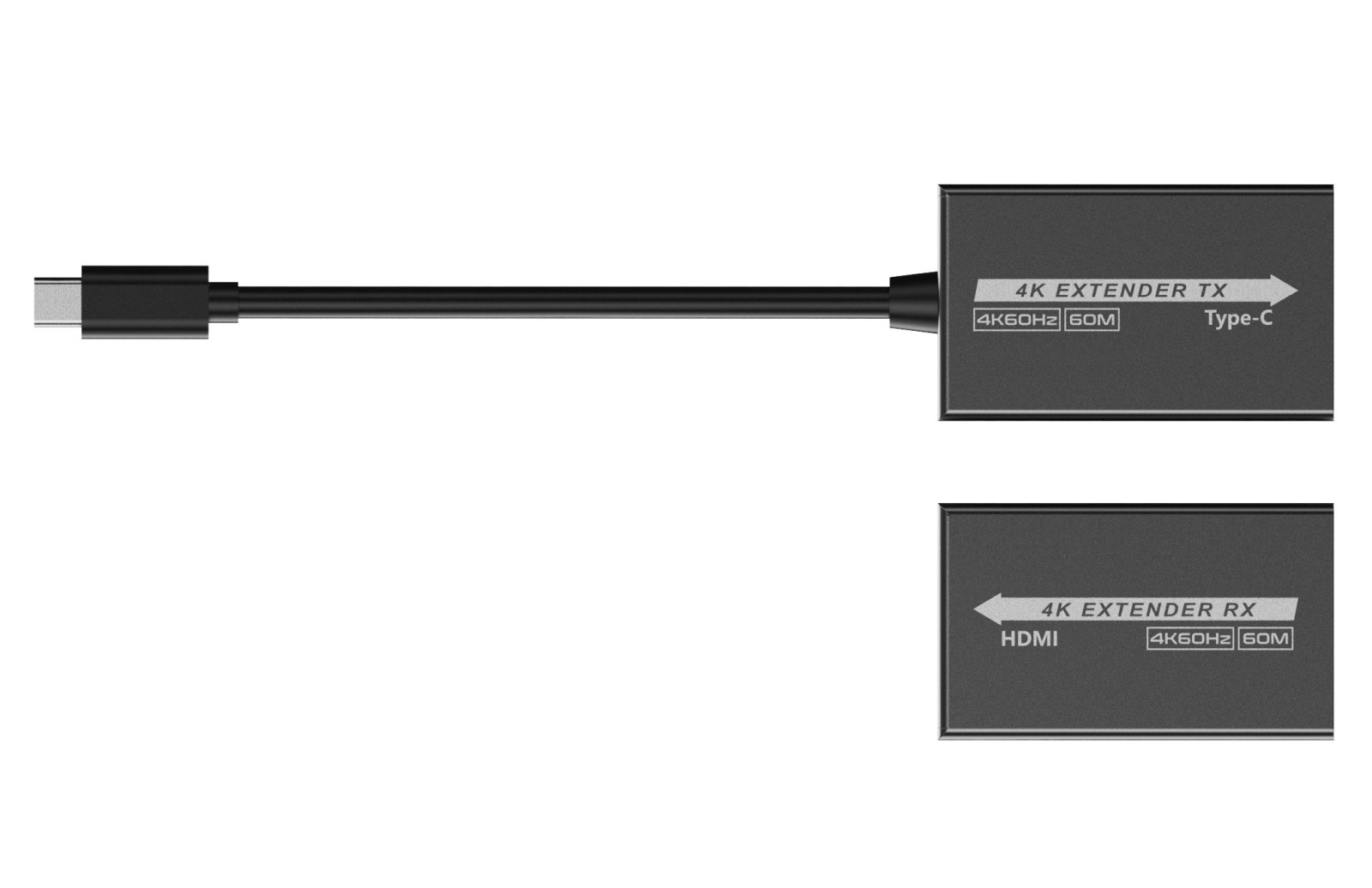 - Sestava se skládá z vysílače TX a přijímače RX, které se propojí kvalitním patch kabelem Cat5e/6/6a. Vysílací zařízení s USB-C konektorem zobrazuje špičkový obraz na HDMI projektoru, monitoru na velkou vzdálenost.