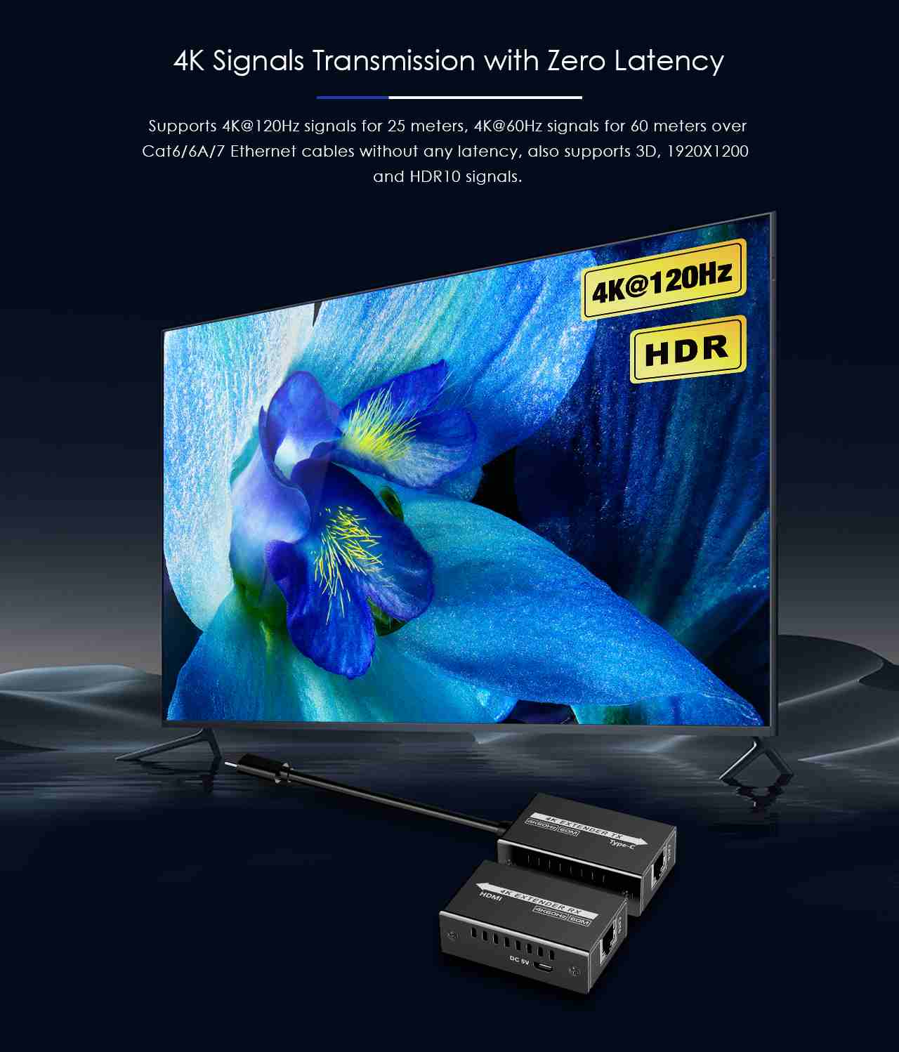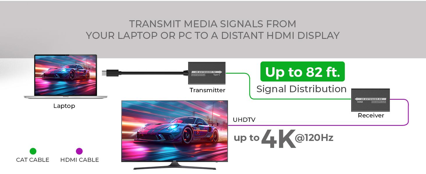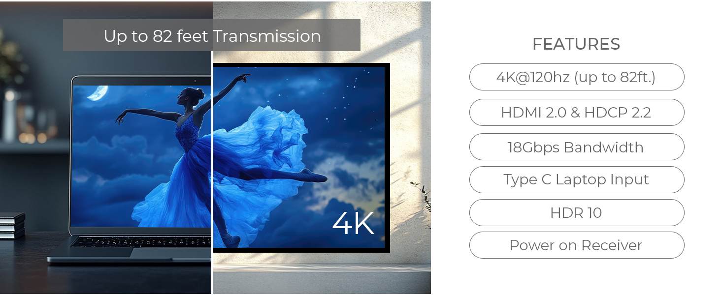 - Podporuje 4K@60Hz na 60m a 4K@120Hz na 30m a FULL HD 1080p až na 60m při použití kvalitního UTP kabelu CAT6 s měděnými vodiči AWG23