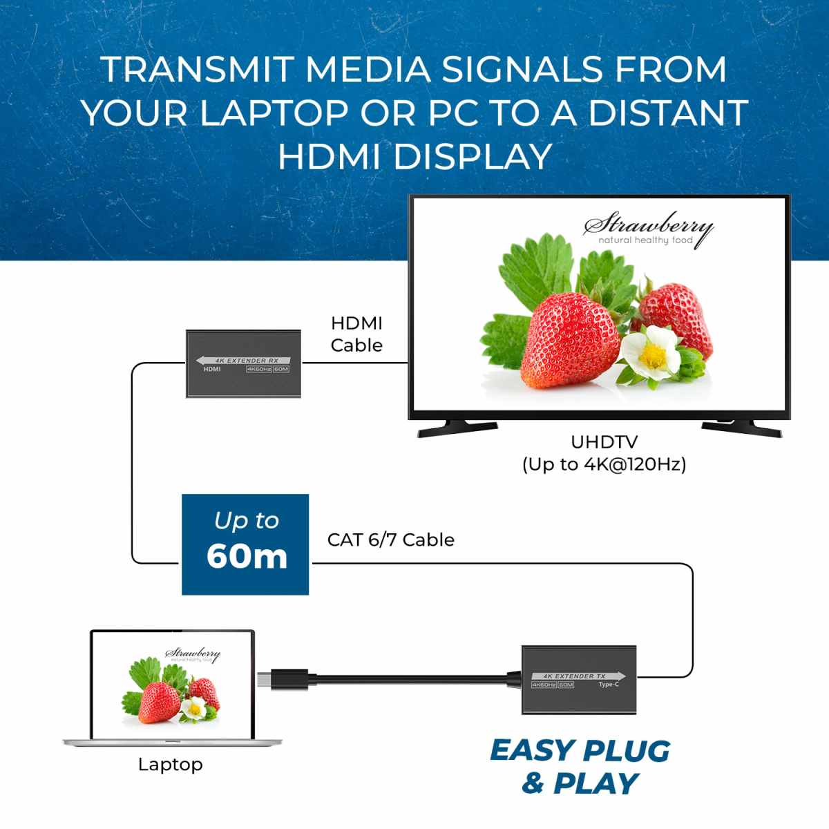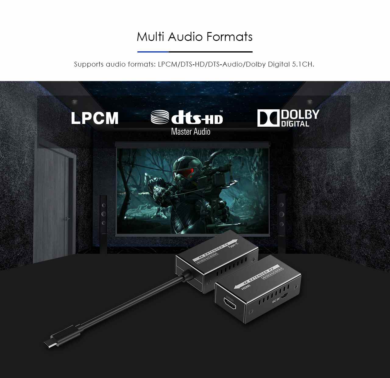 Zařízení umožňuje po jednom síťovém kabelu bez zpoždění přenést audio a video signál o vysokém rozlišení a zobrazit na HDMI monitoru nebo projektoru na vzdálenost 60m.