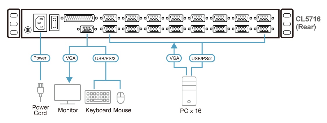 Jeden CL5716 může ovládat až 16 počítačů. Až 31 dalších KVM přepínačů může být připojeno k CL5708, takže až 256 počítačů lze ovládat z jediné KVM konzoly.