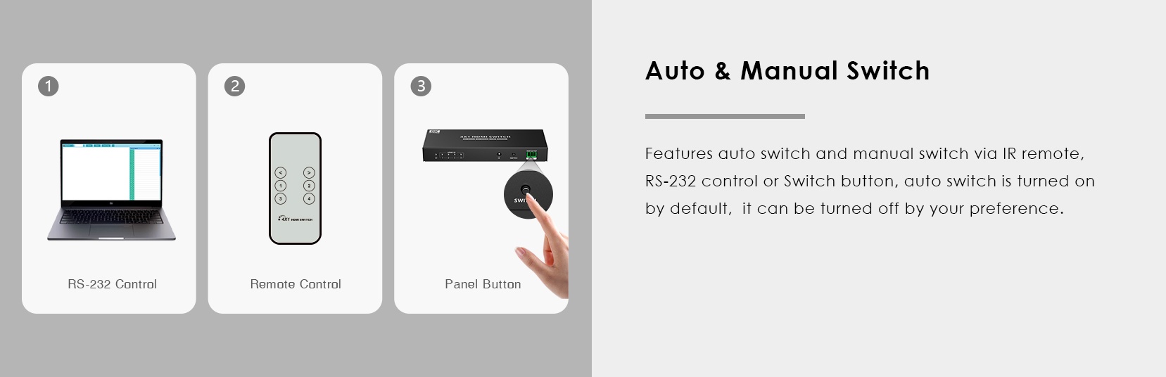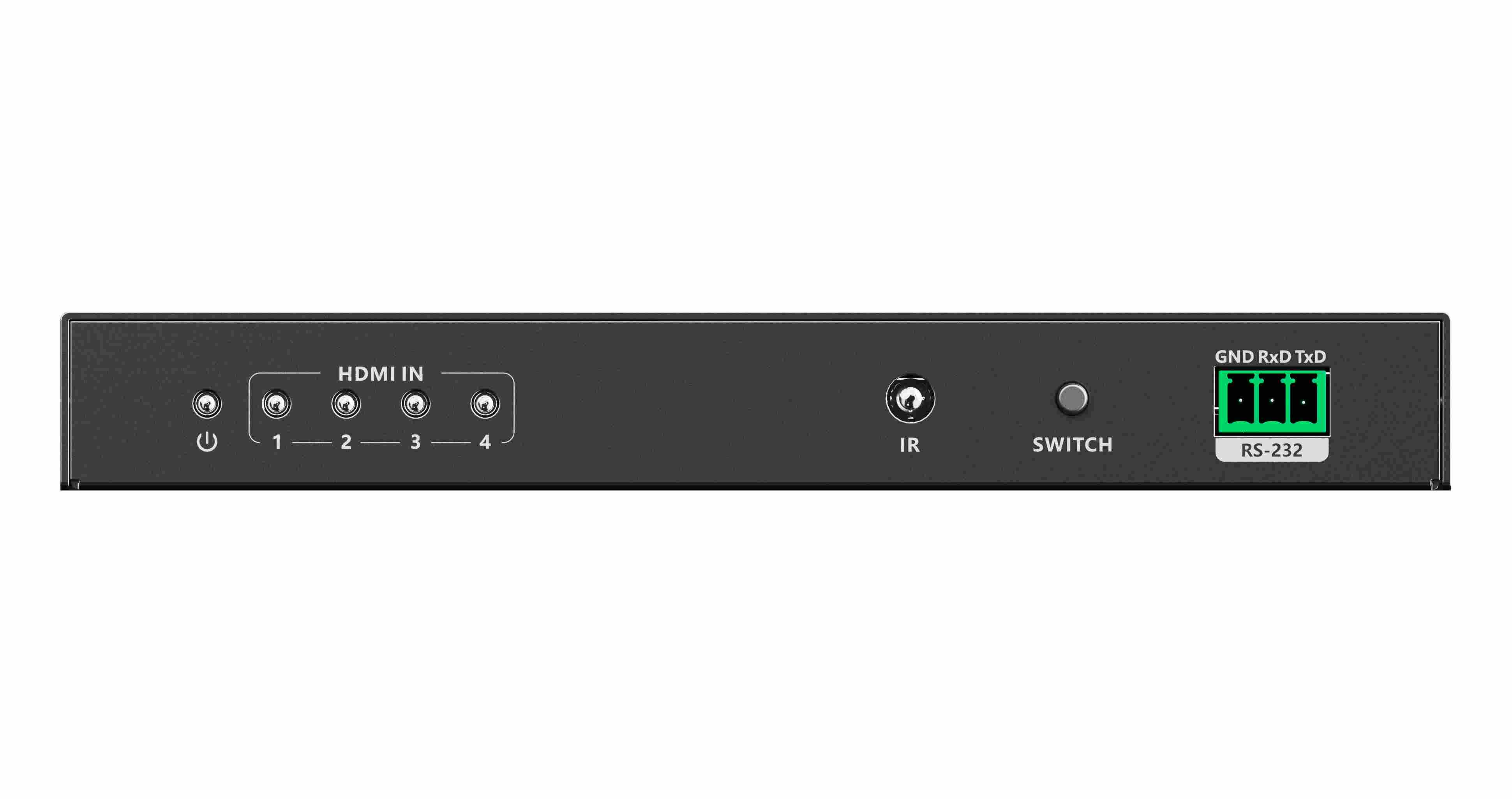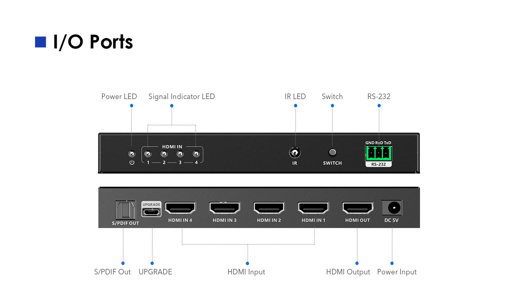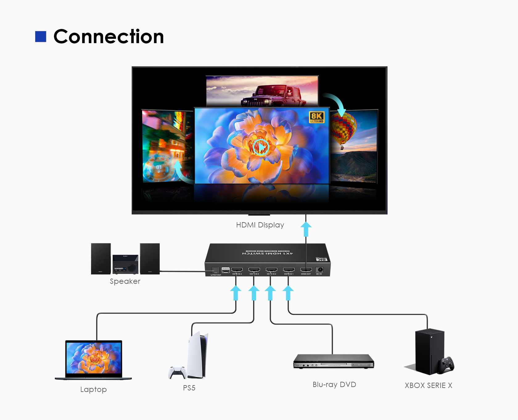 4 HDMI zařízení sdílí 1 HDMI výstupní zařízení (obrazovku). Výběr zařízení tlačítkem nebo dálkovým ovládáním.