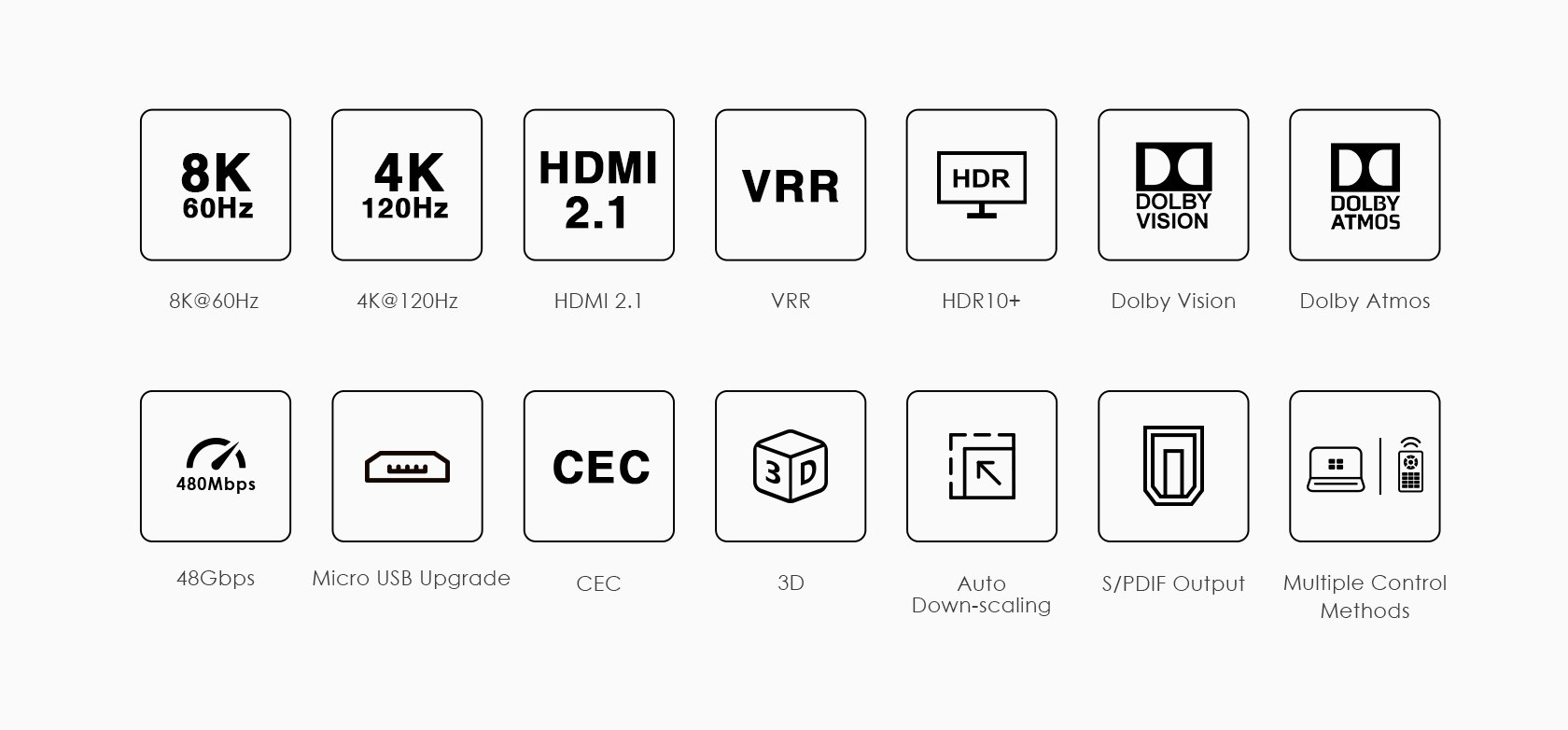 - HDMI rolišení 8K@24/25/30/50/60Hz, 4K@24/25/30/60/100/120Hz, 1080p/1080i