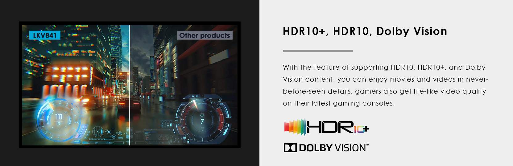 - Podporuje (High Dynamic Range Imaging) HDR10+, HDR10, Dolby Vision, Free Sync, G-Sync