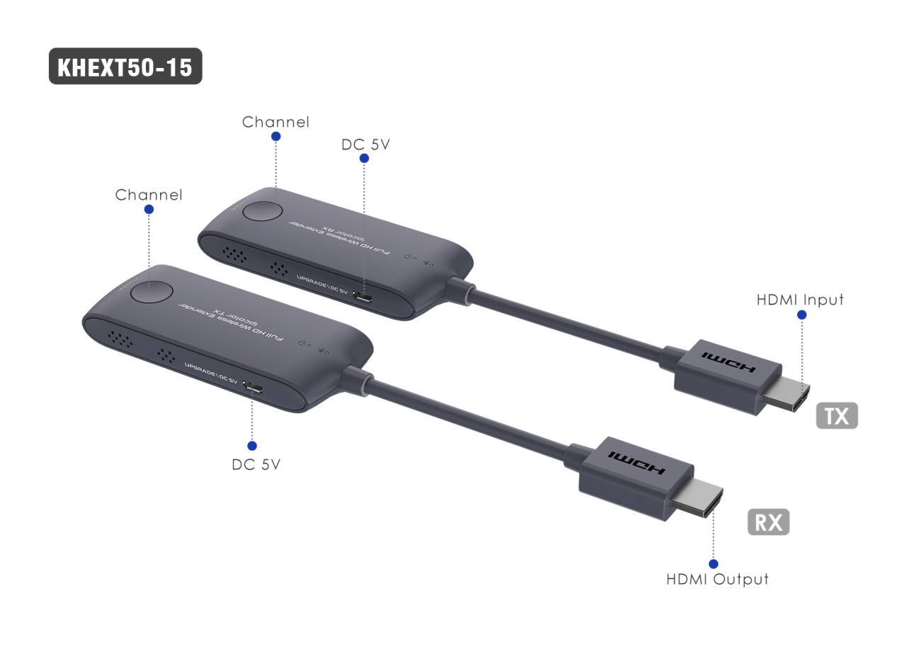 - Vysílací a přijímací adaptéry mají krátký HDMI kabel pro snadné zapojení do počítače a zobrazovače nebo TV.