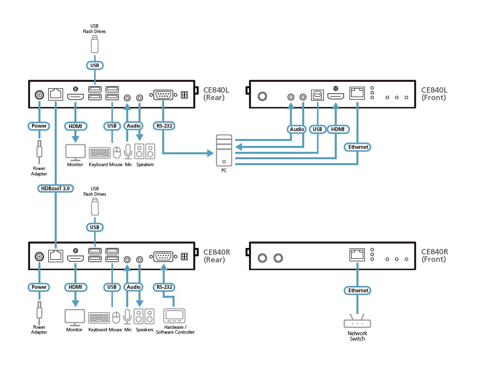 CE840 USB True 4K HDMI HDBaseT 3.0 KVM Extender využívá nejnovější technologii HDBaseT 3.0 místní jednotky a vzdálené jednotky umožňující nekomprimované True 4K HDMI, audio, RS232, Ethernet a USB přenos signálu na vzdálenost až 100 m přes jeden kabel Cat 6A (doporučen kabel ATEN 2L-2920 Cat 6A) nebo