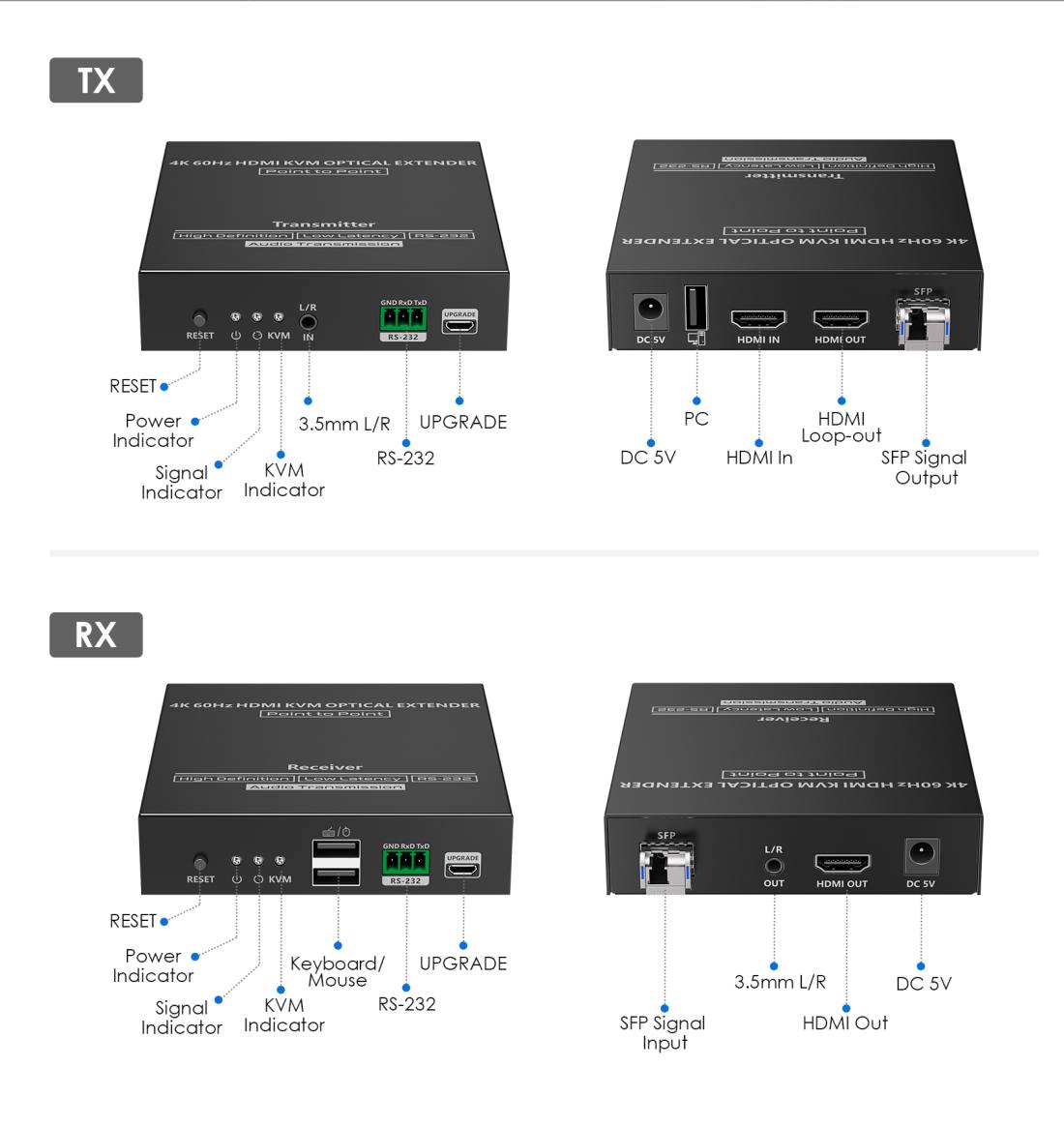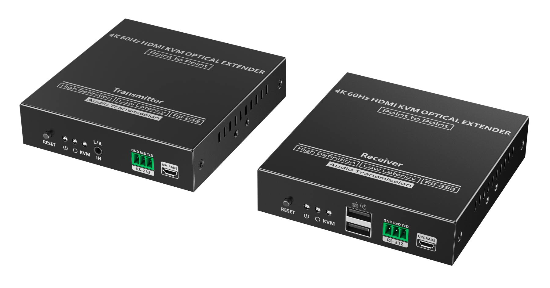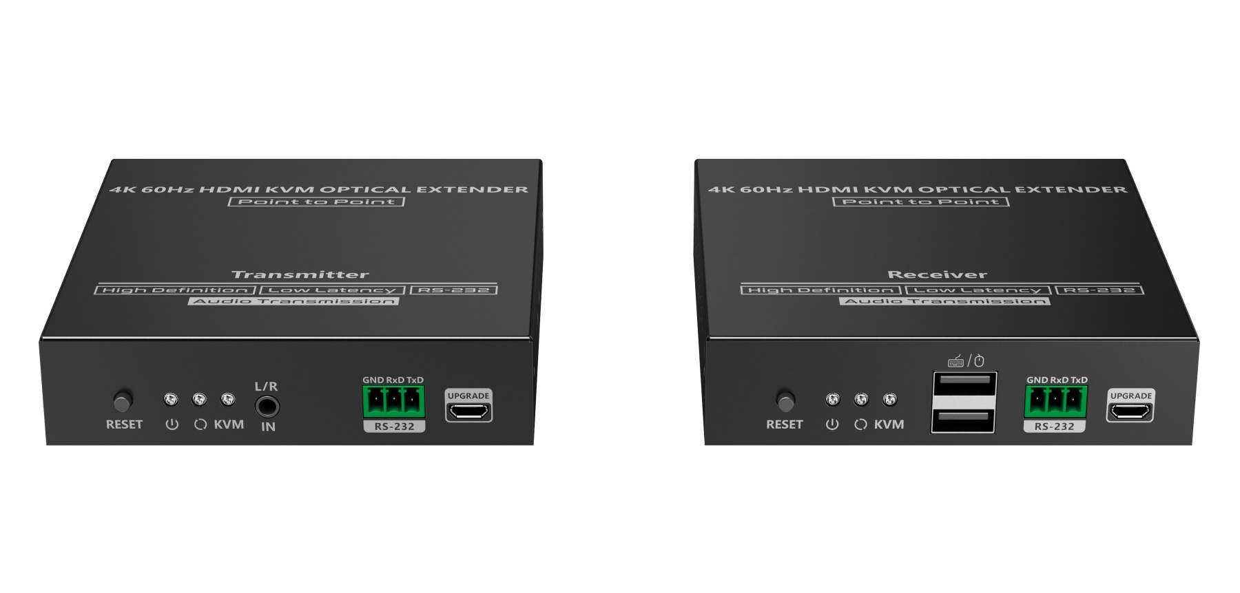 - Vysílač TX má USB konektor pro připojení do počítače a přijímač RX má dva USB konektory pro připojení klávesnice a myši na ovládání PC na velkou vzdálenost
