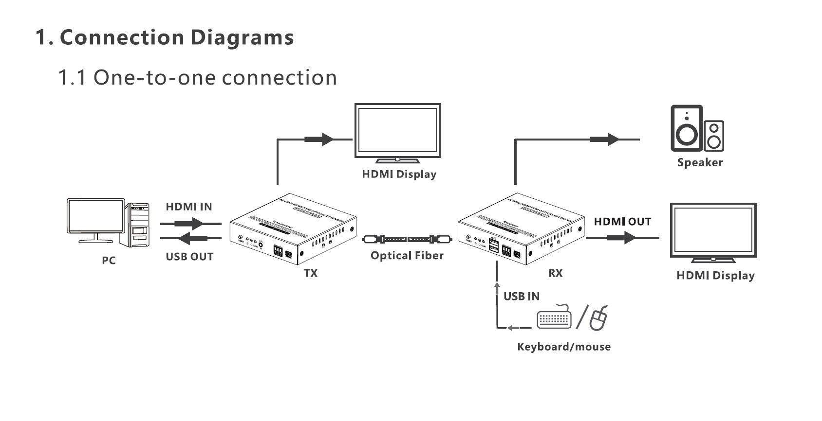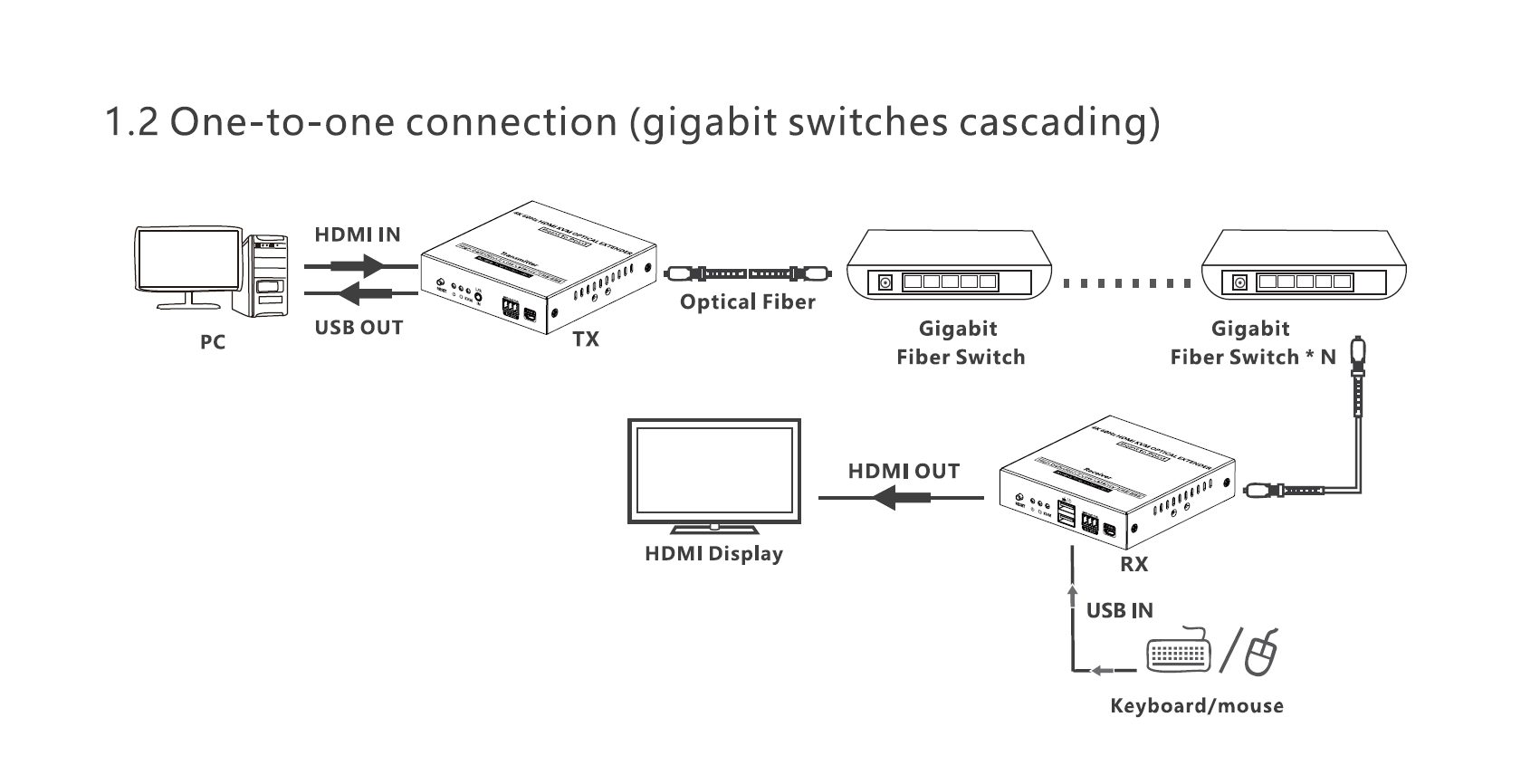 - Extender umožňuje propojení jeden na jeden nebo za pomoci optického switche do kaskády.