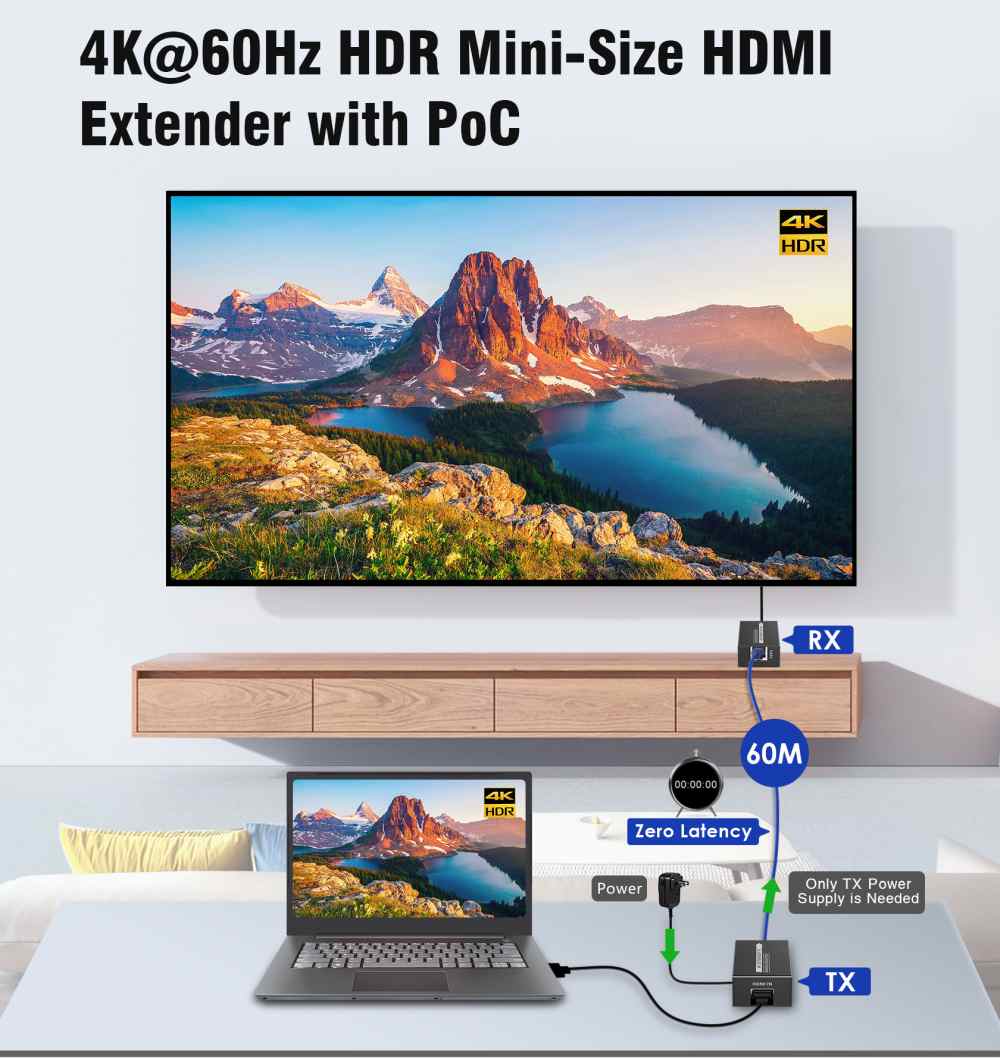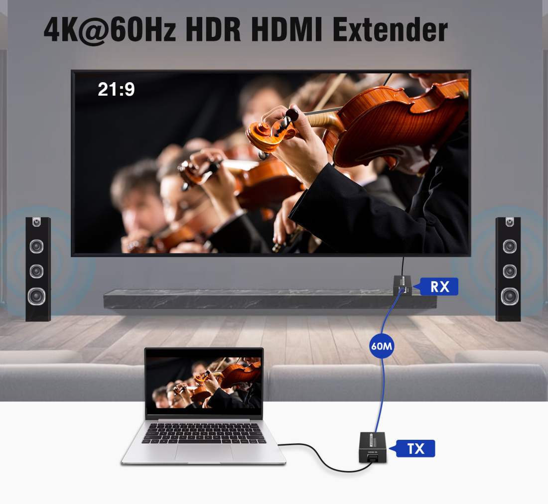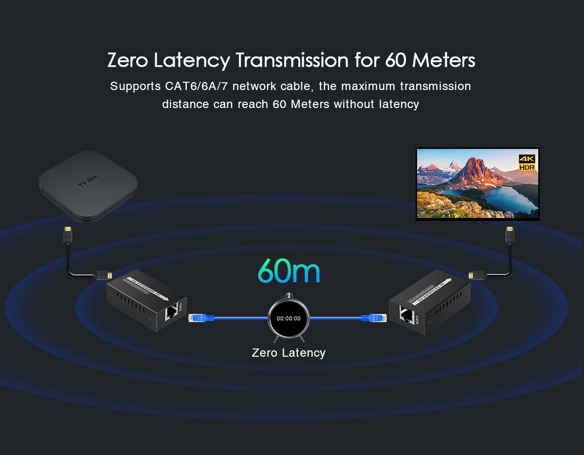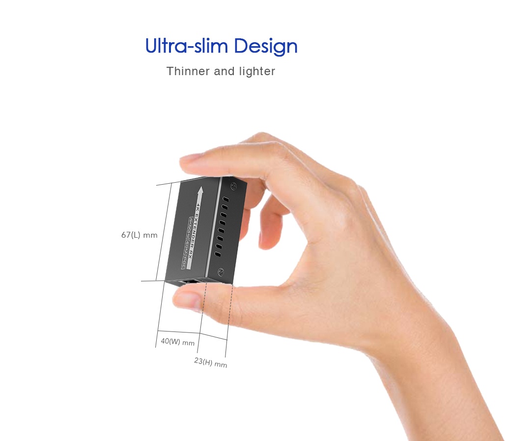 Zařízení umožňuje po jednom kvalitním síťovém kabelu přenést špičkový obraz o vysokém rozlišení 4K@60Hz nebo FULL HD 1080p signál až na 60m.