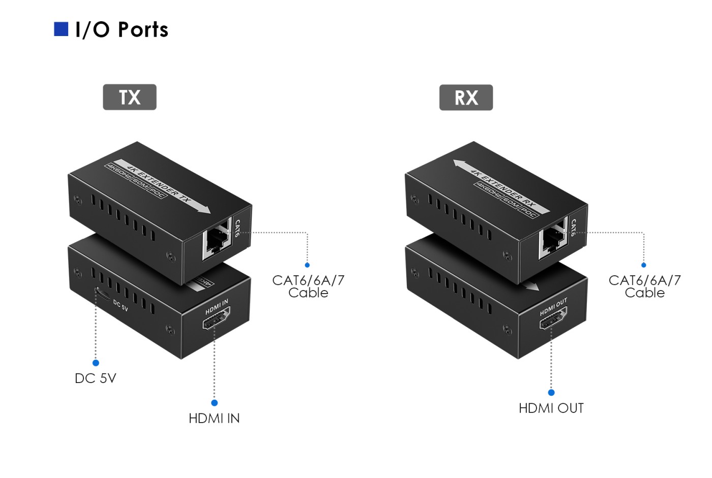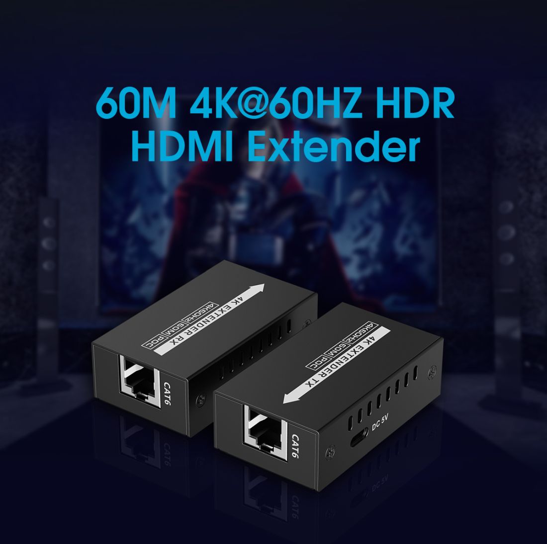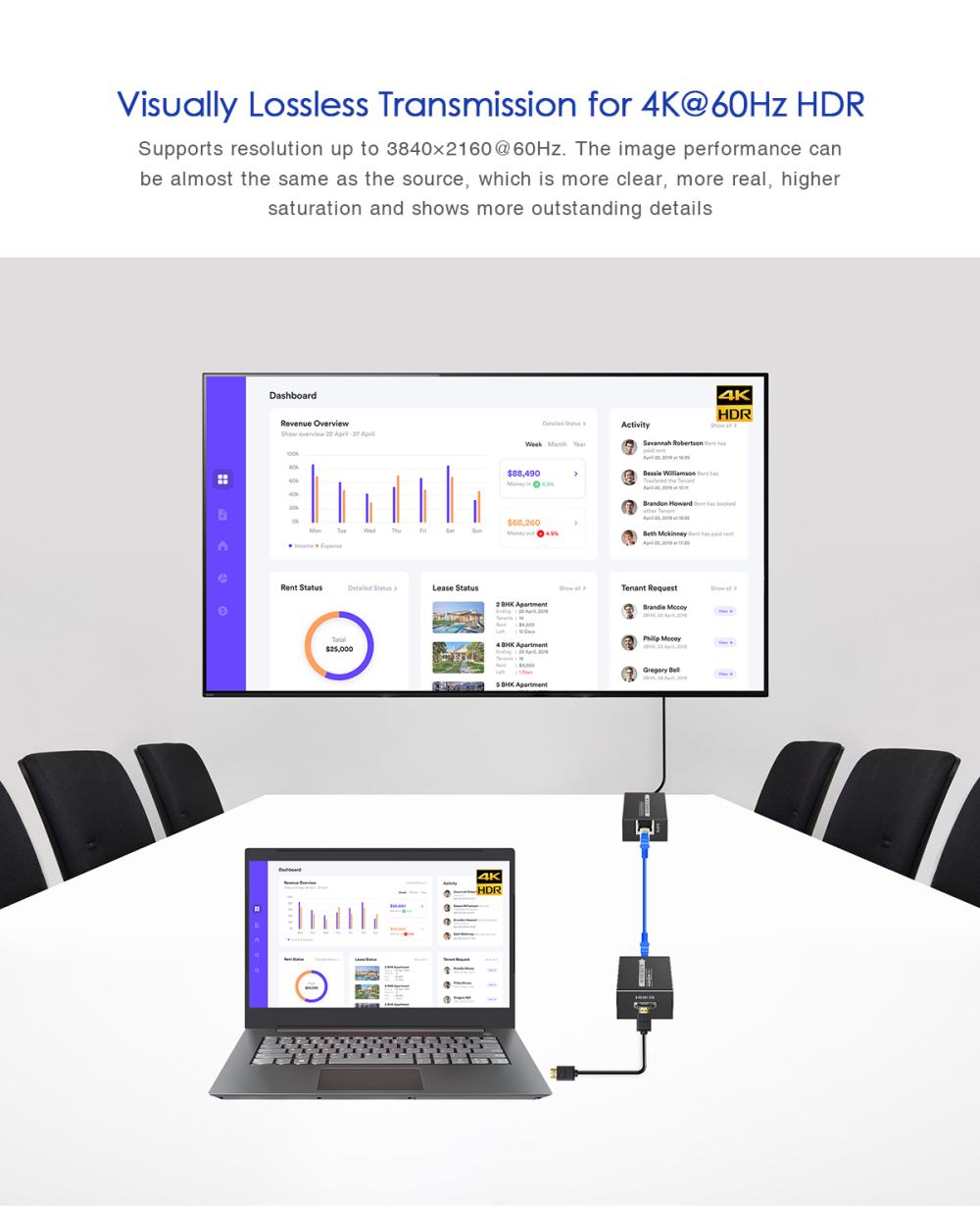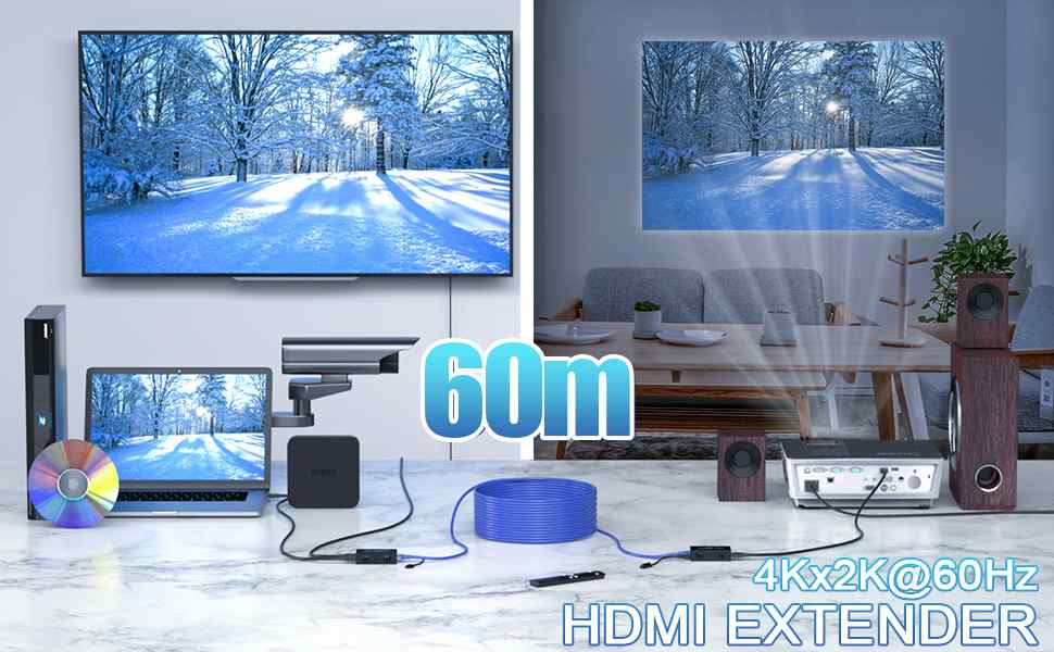 Zařízení umožňuje po jednom kvalitním síťovém kabelu přenést špičkový obraz o vysokém rozlišení 4K@60Hz nebo FULL HD 1080p signál až na 60m.