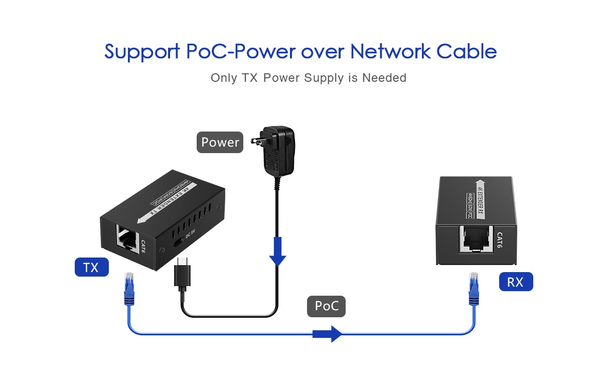 - Vysílač a přijímač jsou napájeny jedním napájecím adaptérem 5V/2A, který se zapojí do vysílače. Podporuje PoC (Power over Cable)