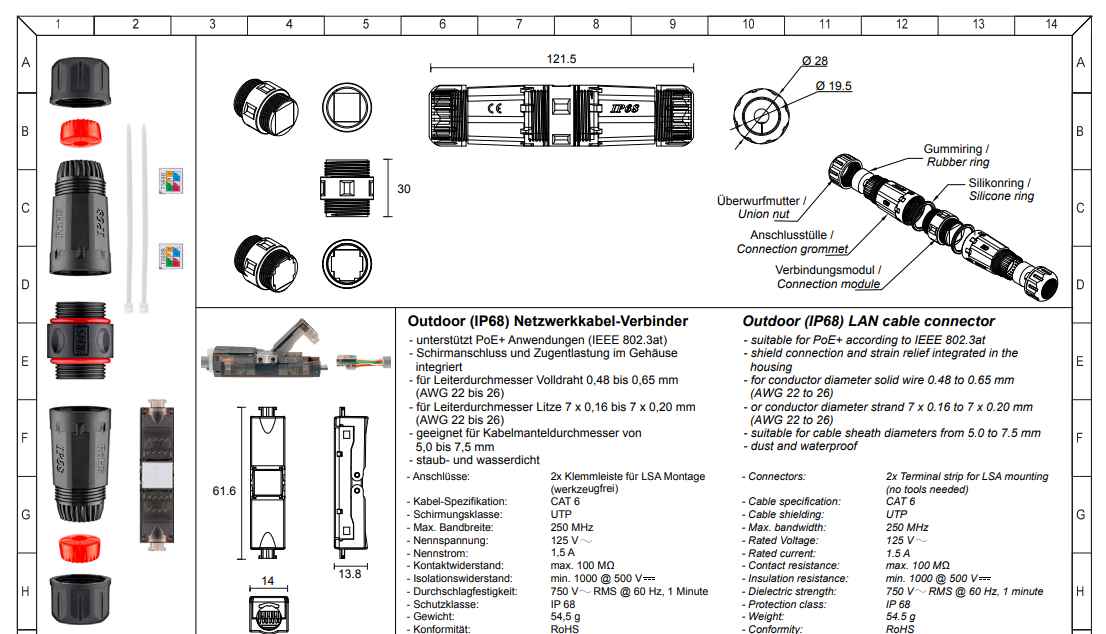 Kabelová spojka je určena pro 8-žilové připojení, prodlužování, opravu nebo přesměrování datových kabelů. Hlavní výhodou konektoru oproti propojovacím boxům CAT je jeho tenký design. S produktem můžete realizovat prodlužování kabelů i ve stísněném prostoru, např. v kabelových kanálech.