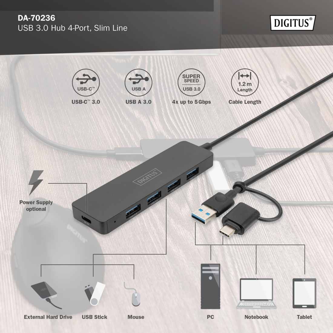 DIGITUS USB 3.0, Hub 4-Port, Slim Line with 120cm cable with USB-C adapter