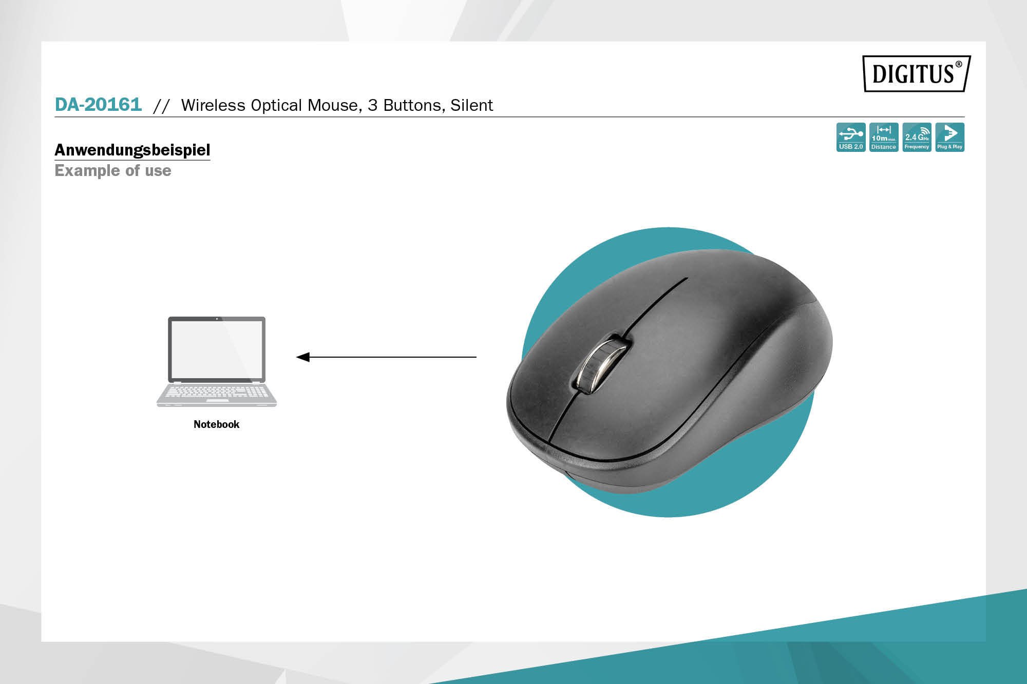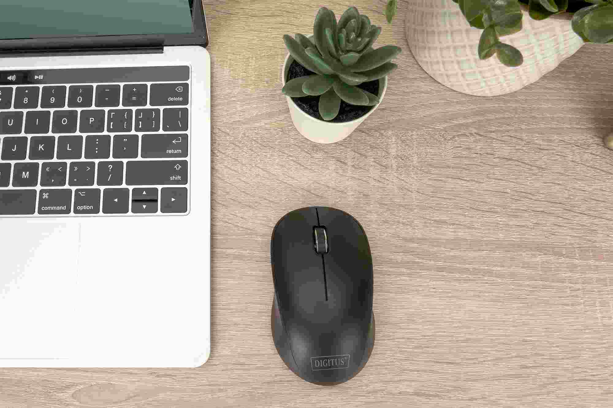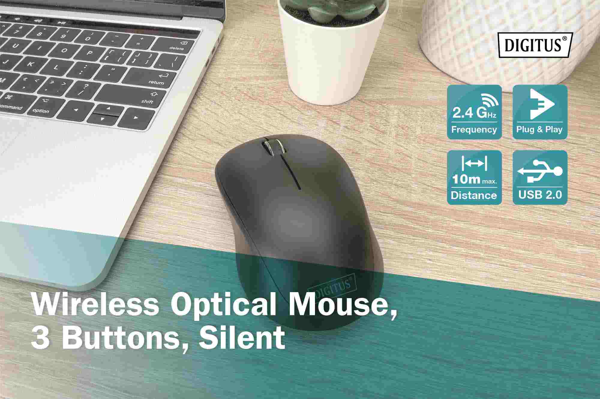 DIGITUS Bezdrátová optická myš, 6 tlačítek, ergonomická, optická myš Business Mouse byla speciálně navržena pro použití na PC i noteboocích. Zařízení nabízí maximální flexibilitu díky 6 tlačítkům a rolovacímu kolečku, technologie 2,4 GHz