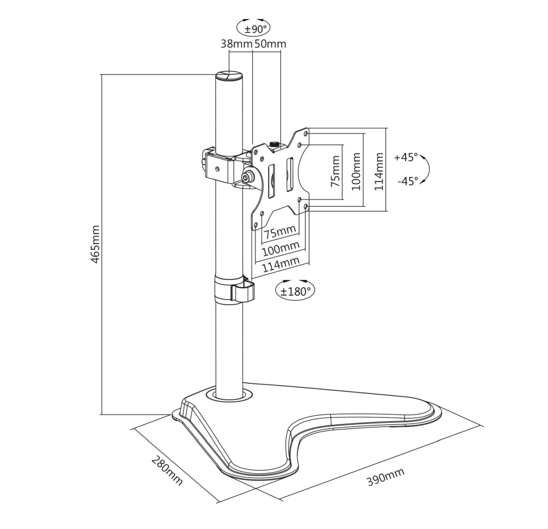 - Vhodné pro (zakřivené) monitory do 32" / 8 kg max. - Rychlé uvolnění: Desku VESA lze při montáži a demontáži upevnit/uvolnit pomocí šroubu - Výškově nastavitelné, otočné, otočné - Kompatibilita VESA: 75x75, 100x100 - Integrované vedení kabelů: pro organizovaný a uklizený pracovní prostor - Upevnění monitoru: Náklon: -45°/+45°, Otočení: -90°/+90°, Rozsah otáčení předního panelu: -180°/+180° - Materiál: ocel, plast - Povrch: Práškový lak - Počet monitorů: 1 - Typ montáže: Stojan - Barva: Černá, matná - Hmotnost monitoru (max.): 8 kg - Způsob montáže: Stojan - Počet monitorů: 1 - Velikost monitorů: až 32" - Uchycení VESA: 75x75 mm, 100x100 mm