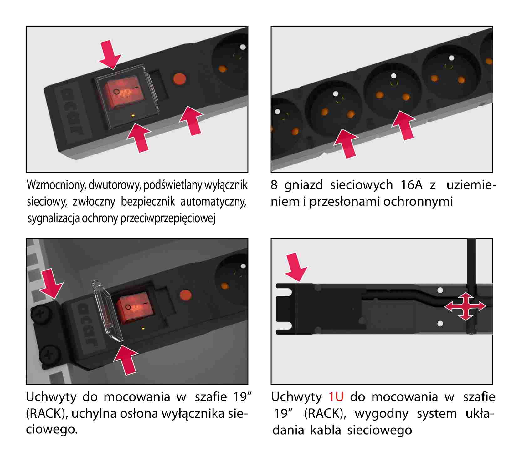 Zařízení proti přepětí acar PDU RACK je verze zařízení rodiny acar PDU s profesionálním aplikačním profilem, určená pro instalaci do 19" racku. Zařízení velikosti 1U má osm chráněných napájecích zásuvek s uzemněním, které ve většině případů postačují k napájení všech přijímačů instalovaných v 19" racku. Využívá zesílený síťový vypínač, odolný proti velkým proudovým rázům vznikajícím např. při zapínání počítačových zdrojů (stacionárních a přenosných zdrojů). Síťový vypínač je vybaven odklápěcím krytem, který zabraňuje náhodnému vypnutí. Vestavěný odrušovací filtr výrazně zvyšuje bezpečnost připojených přijímačů a automatická pojistka umožňuje obnovení provozu systému v krátké době. Zařízení má také indikátor správné činnosti ochranného systému. Odolný a pevný plášť ze samozhášecího materiálu splňuje všechny požadavky na přístroje pro profesionální použití.Přepěťová ochrana varistorem značky TDK.