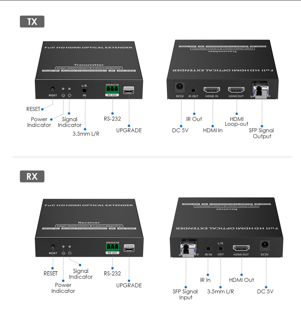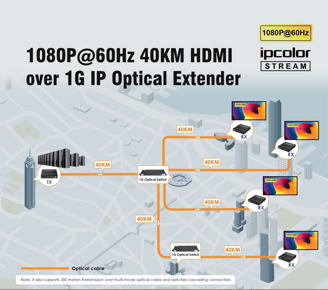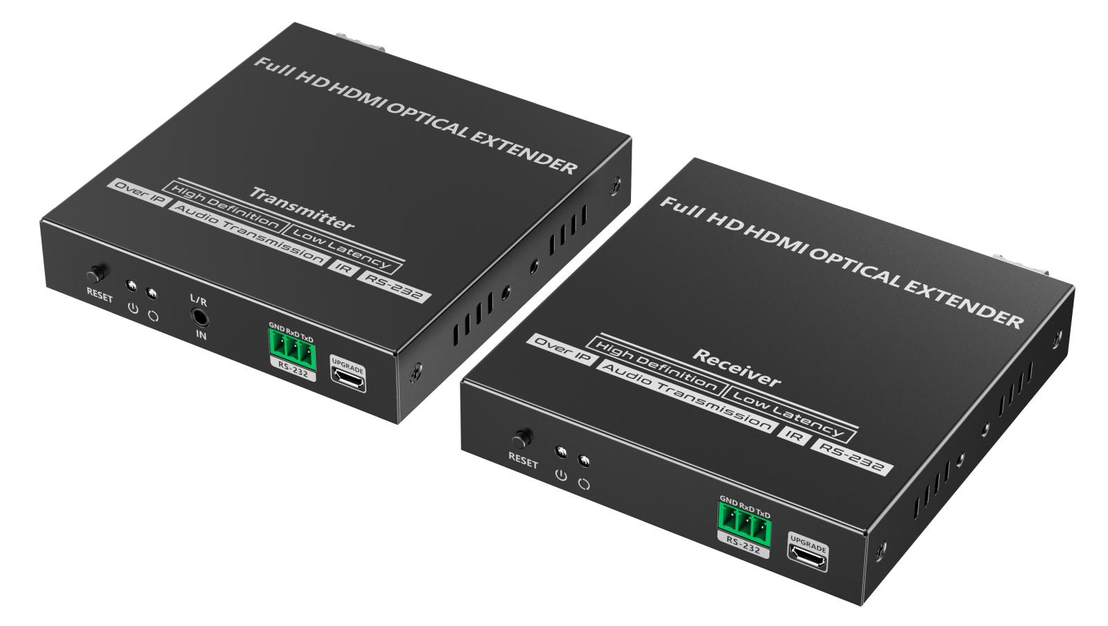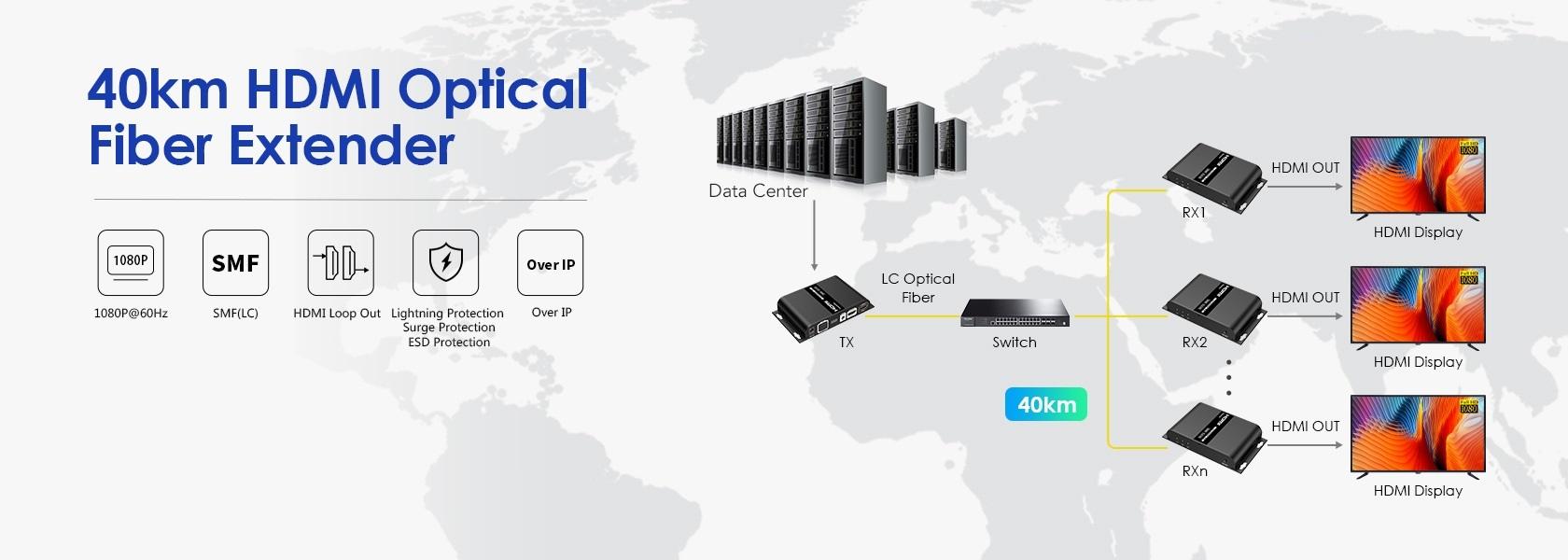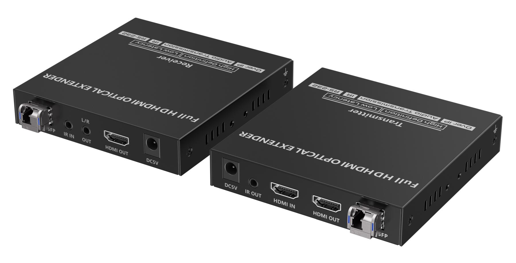Přenášejte obrazové a zvukové signály HDMI na vzdálenost až 40 km pomocí optických kabelů. Kromě toho můžete přenášet signály dálkového ovládání IR do zdrojového zařízení. Zdrojové zařízení tak můžete ovládat z přijímače. Pomocí tohoto vysoce výkonného video systému můžete napájet mnoho přijímačů na velikou vzdálenost pomocí optického přepínače. Tato sada se skládá z modulu vysílače a přijímače a je zvláště vhodná pro přenos signálů HDMI na velké vzdálenosti. Ideální pro spojení mezi budovami nebo velkými průmyslovými komplexy.