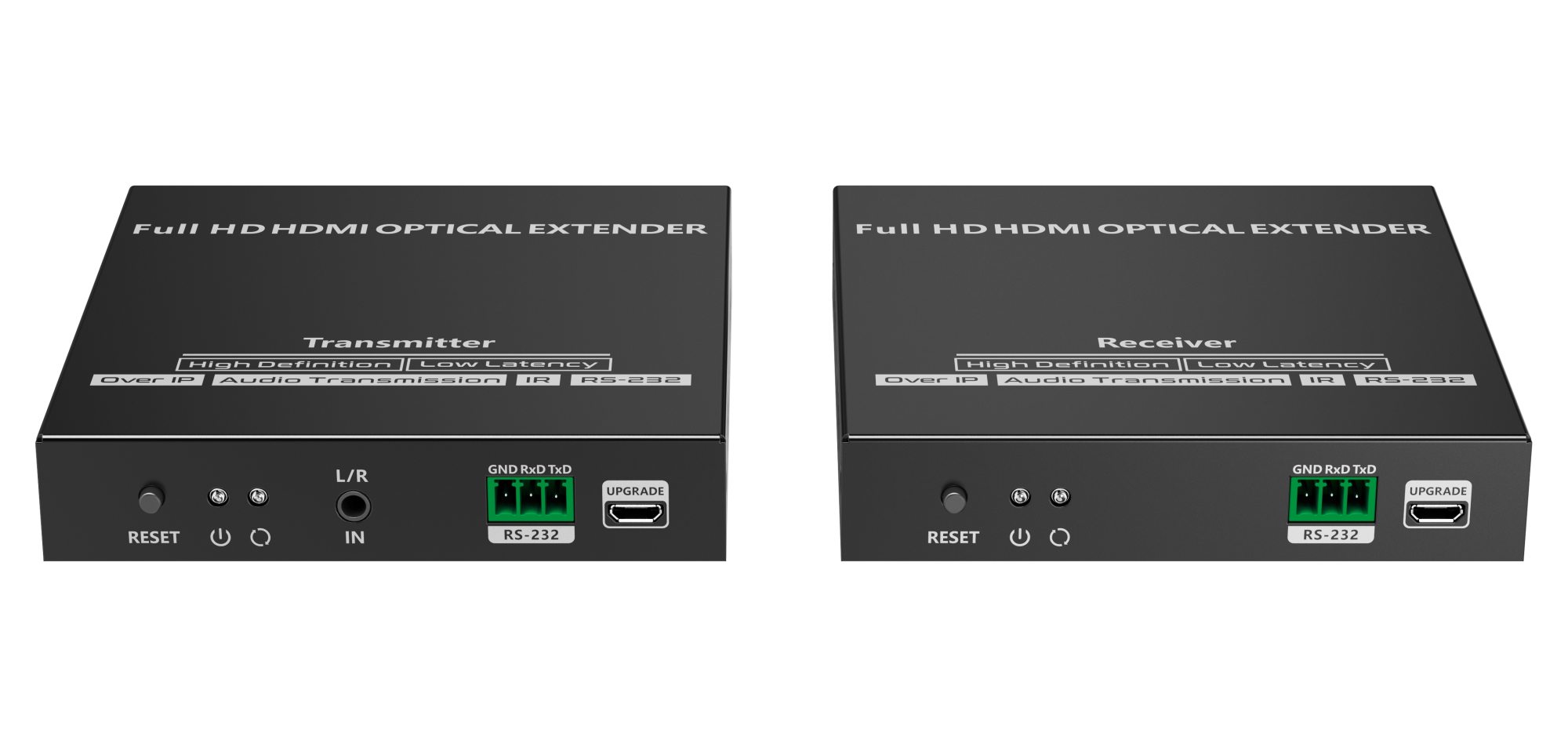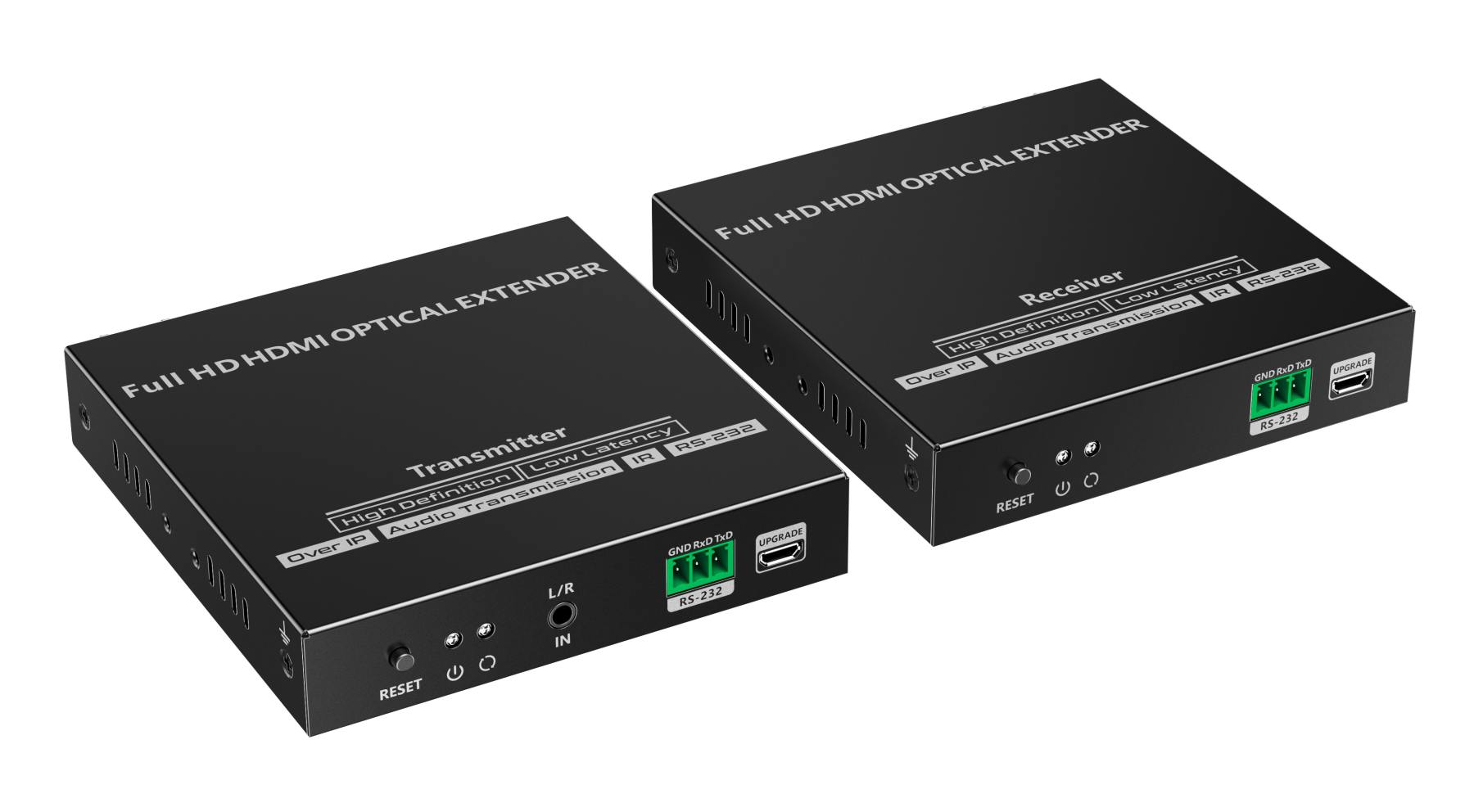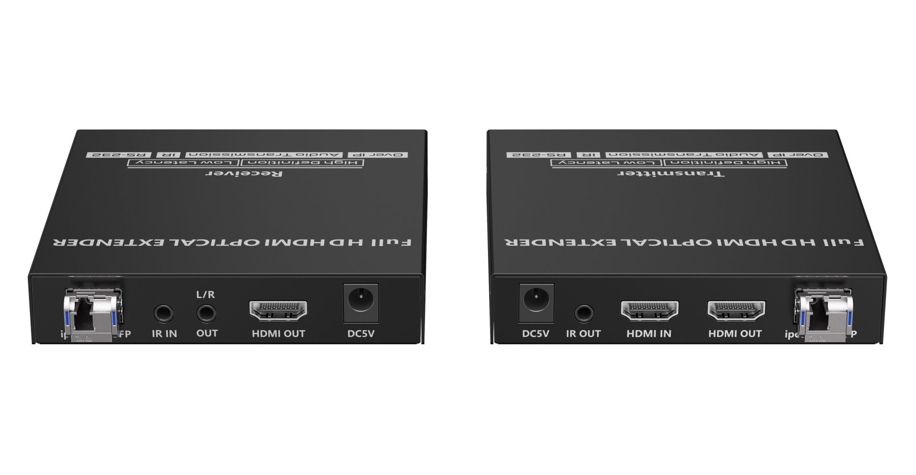 - Sestava se skládá z vysílače, přijímače, dvou SFP optických modulů, dvou napájecích zdrojů a kabelů pro IR ovládání.