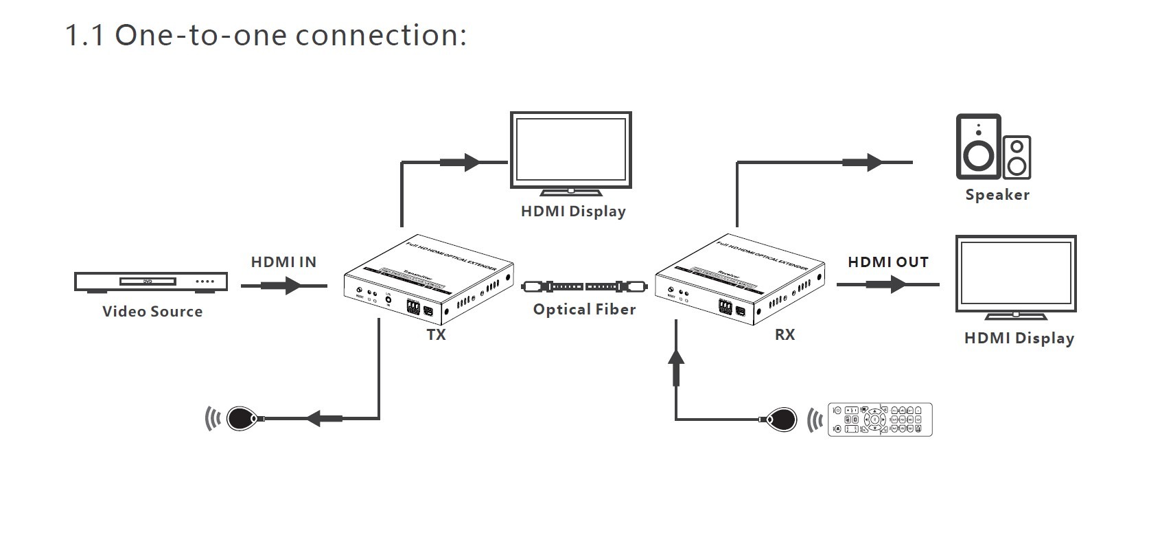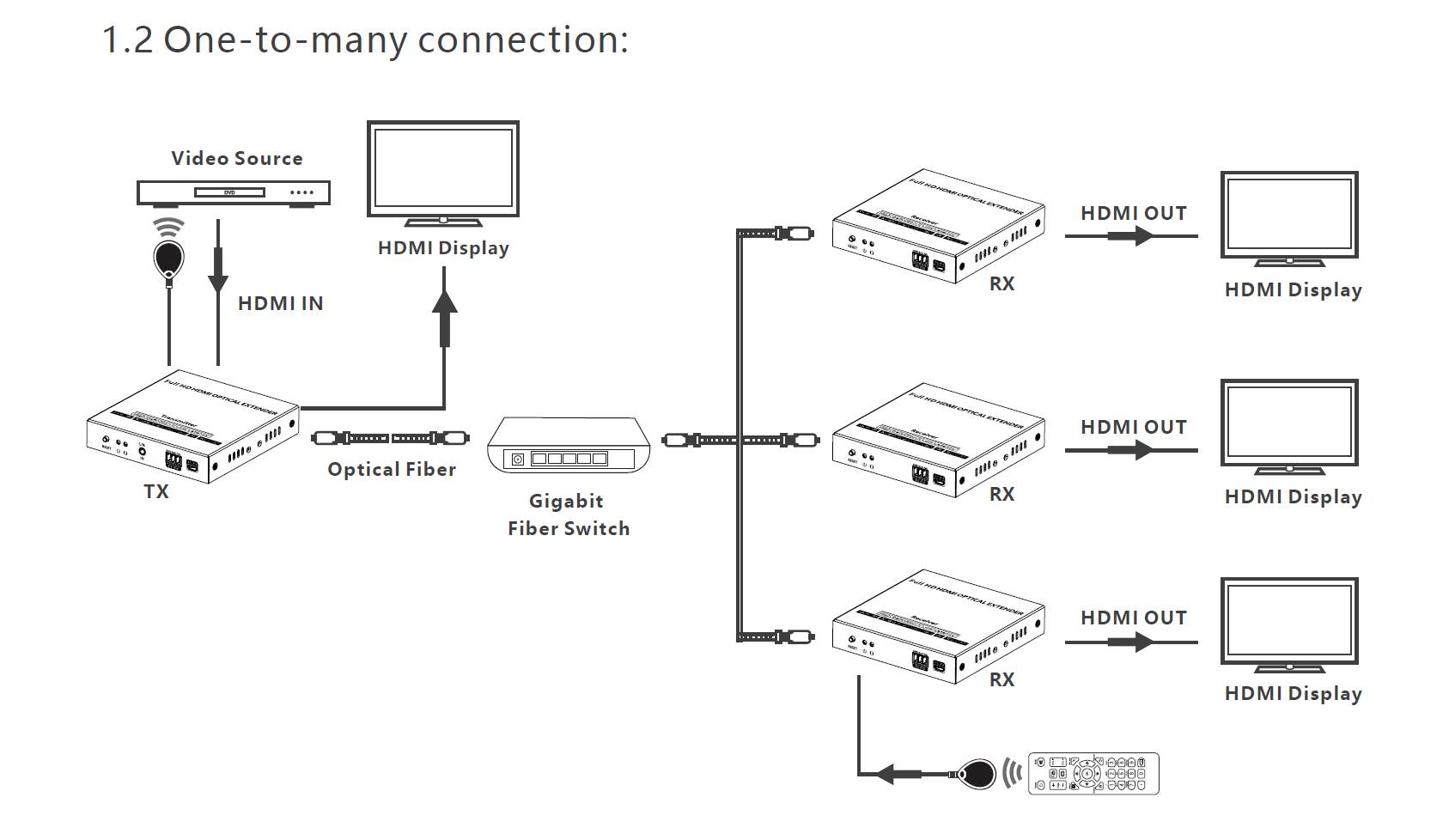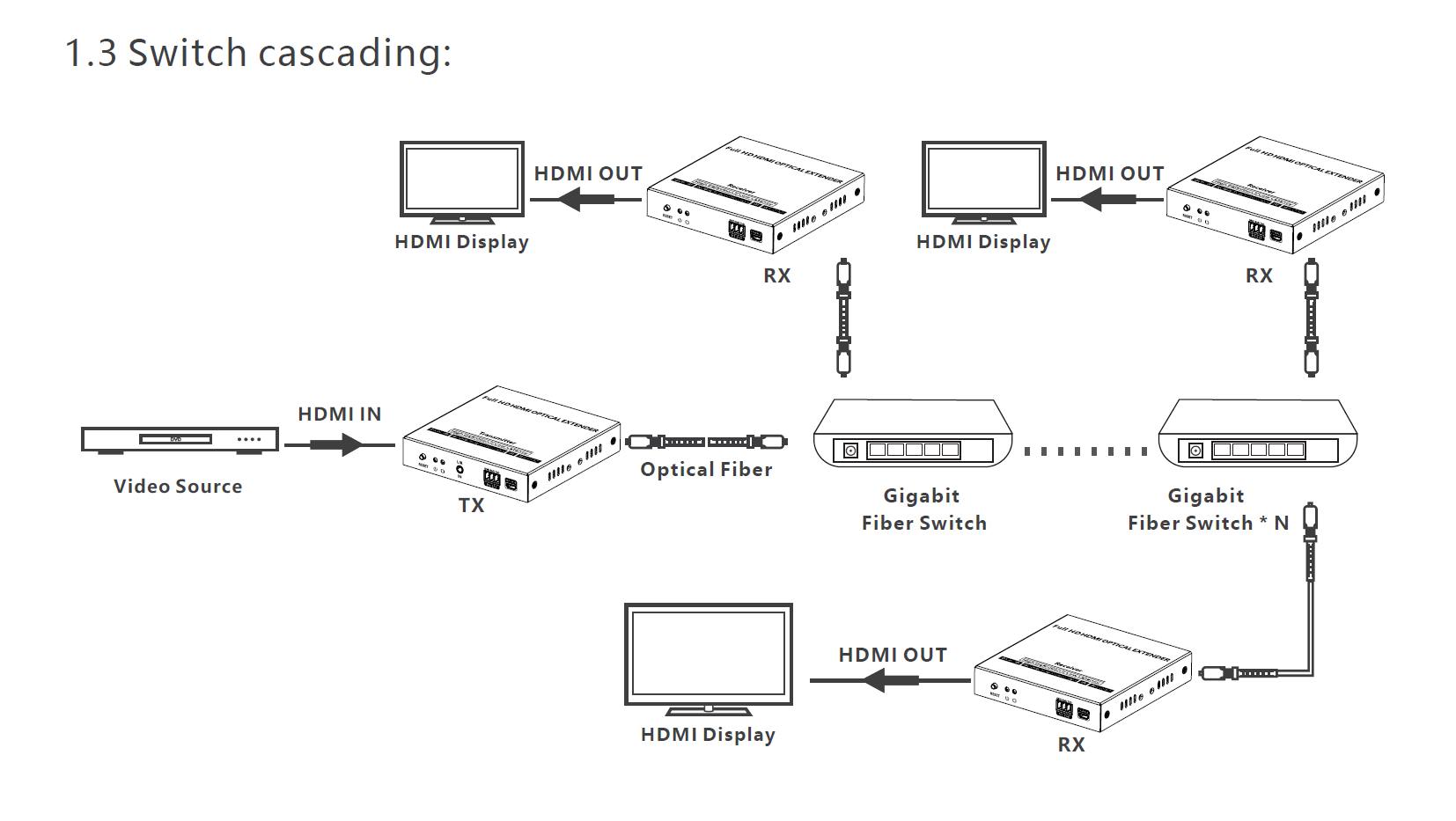 - Extender umožňuje propojení jeden na jeden nebo za pomoci optického switche jeden na více nebo do kaskády, jak je znázorněno v přiložených fotografiích