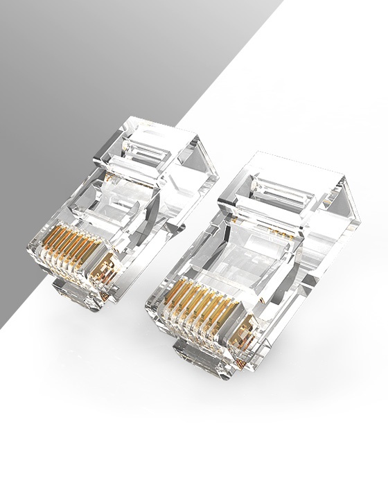 Konektor RJ45 nestíněný CAT6 krimpovací pro kulaté kabely, RJ45 8P8C 8 pinů, nestíněný konektor, vhodné na lanko a drát Cat6, 2 x prong, balení 100ks
