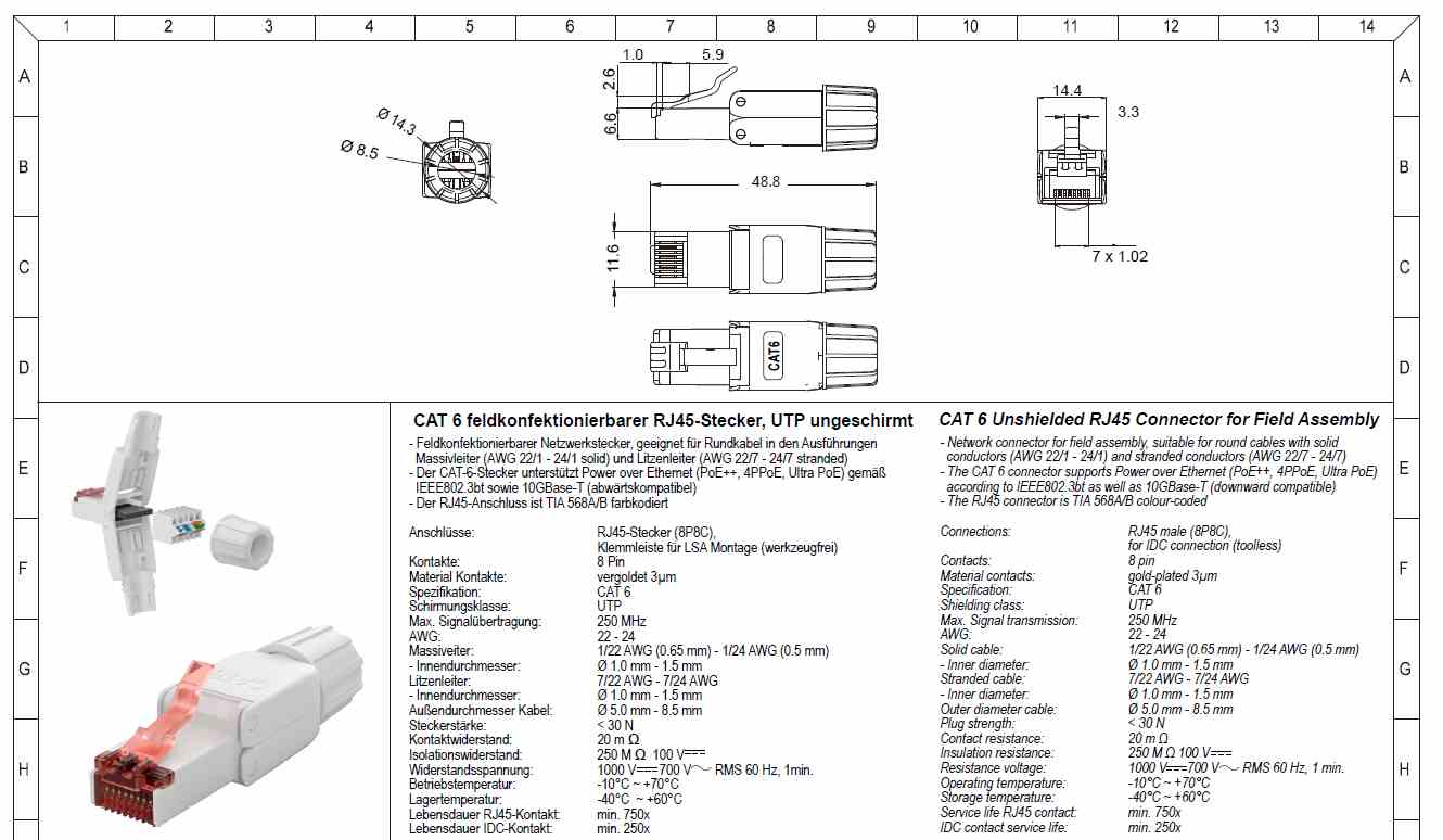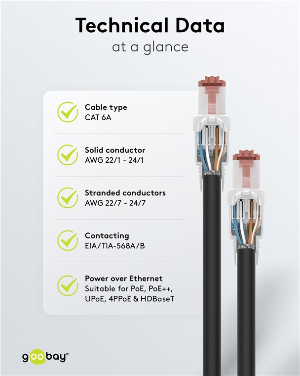 - Konektor CAT 6 podporuje napájení přes Ethernet (PoE++, 4PPoE, Ultra PoE) podle IEEE802.3bt a také 10GBase-T (kompatibilní se směrem dolů)