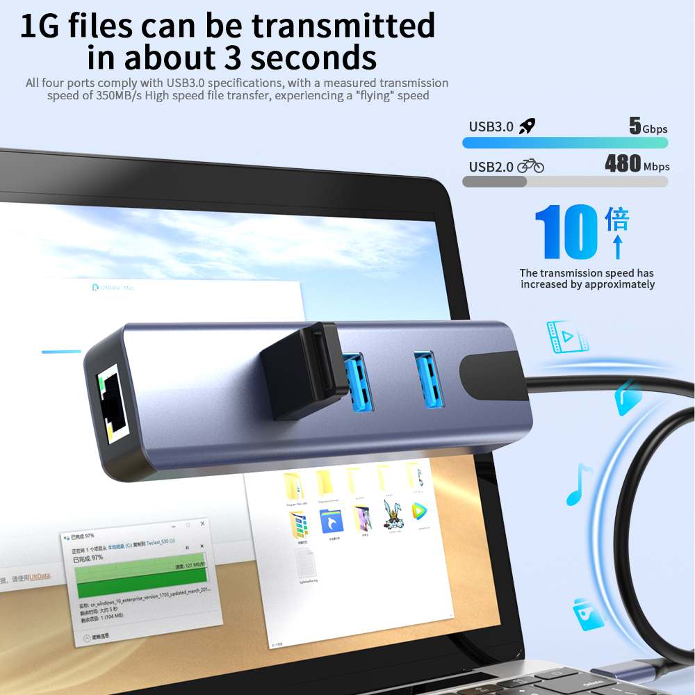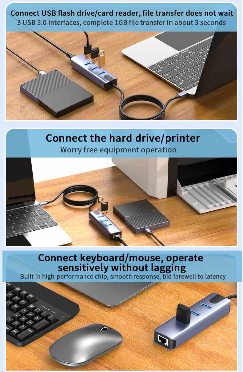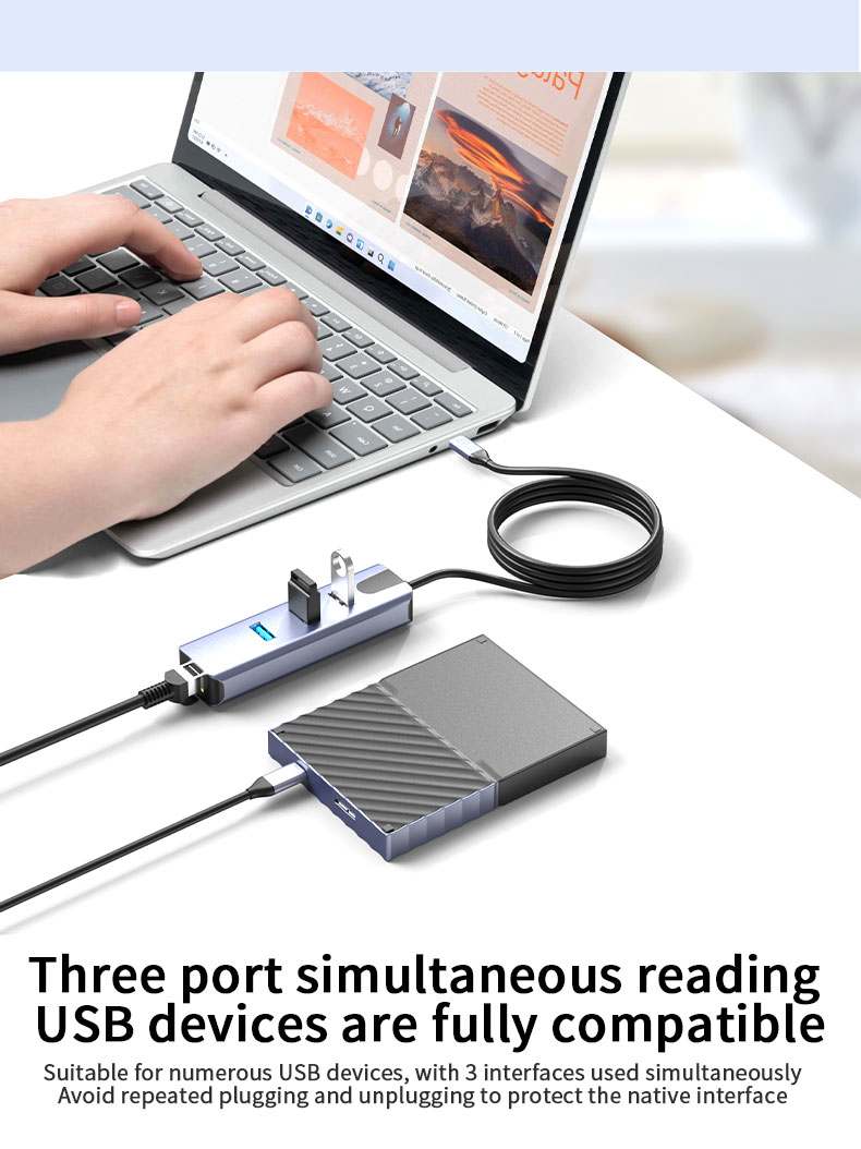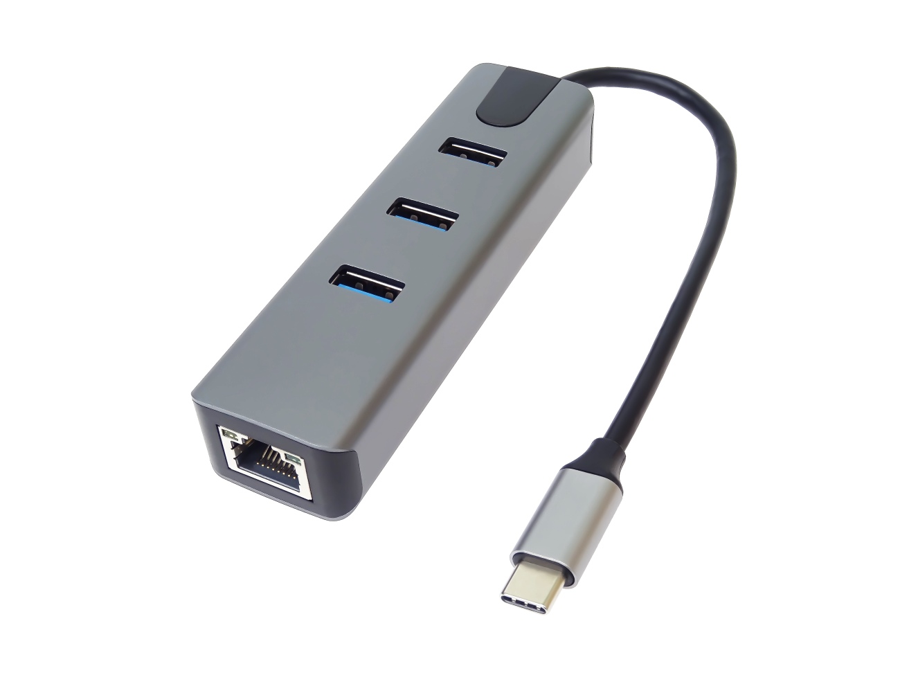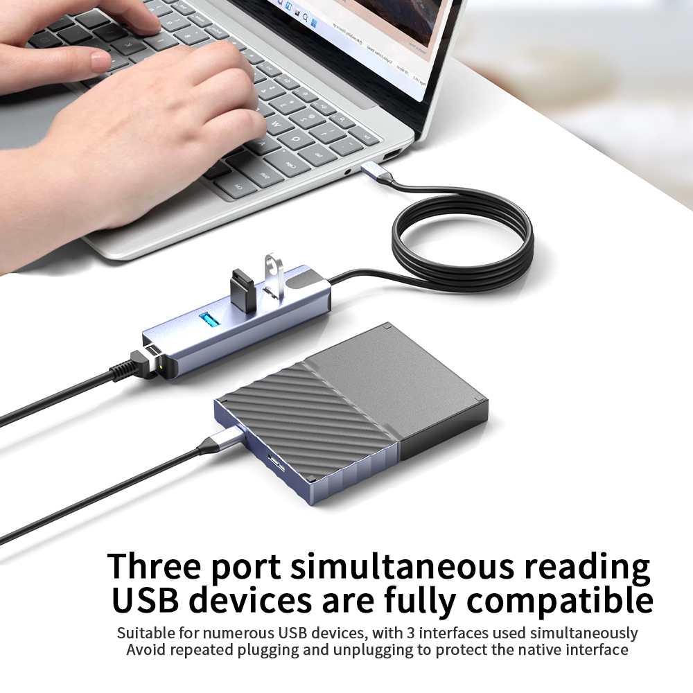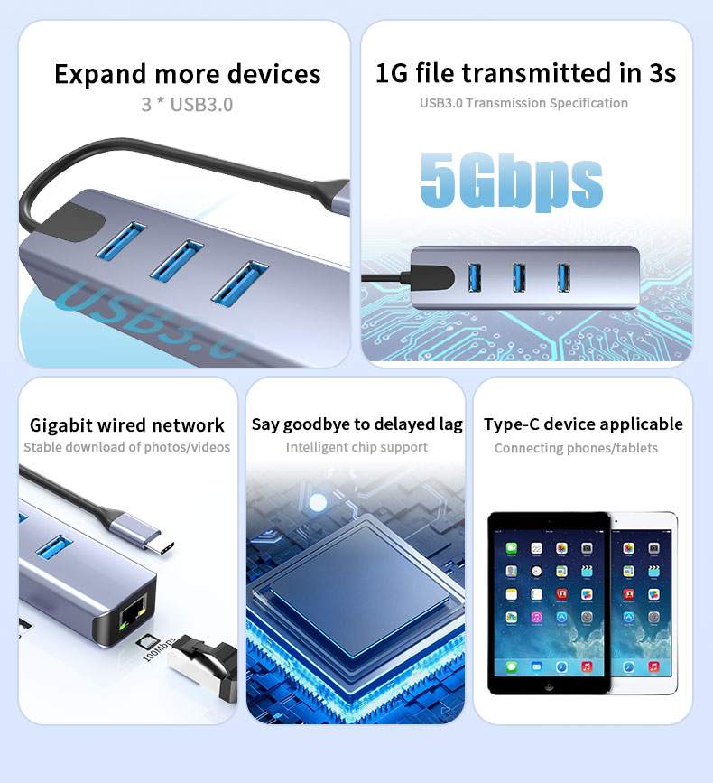 Převodník, který umožní připojit Váš počítač s portem USB typu C do internetu nebo k lokální síti pomocí kabelu s RJ45 (Gigabit) a navíc umožňuje zapojit tři USB3.2 (5 Gbps) periferie jako USB disk, tiskárnu, klávesnici a myš