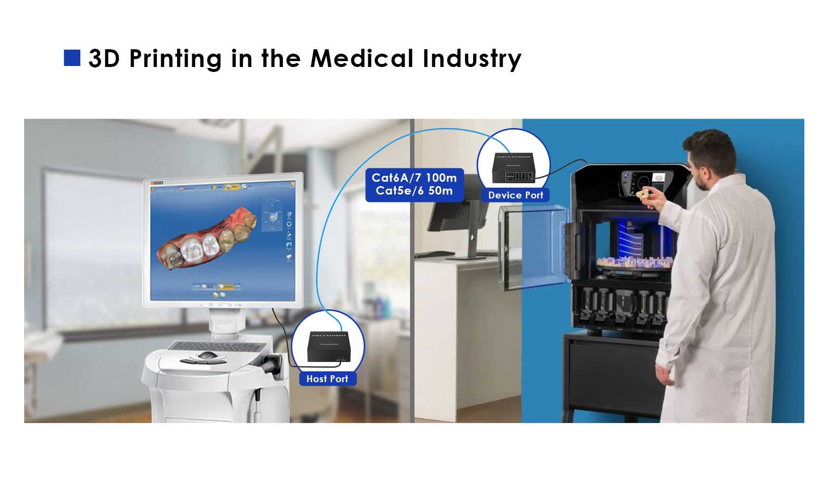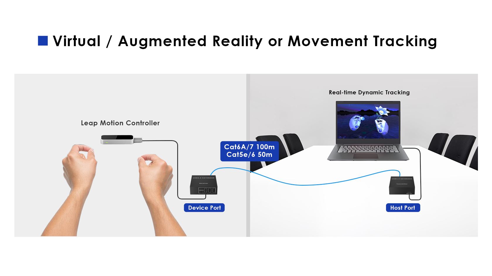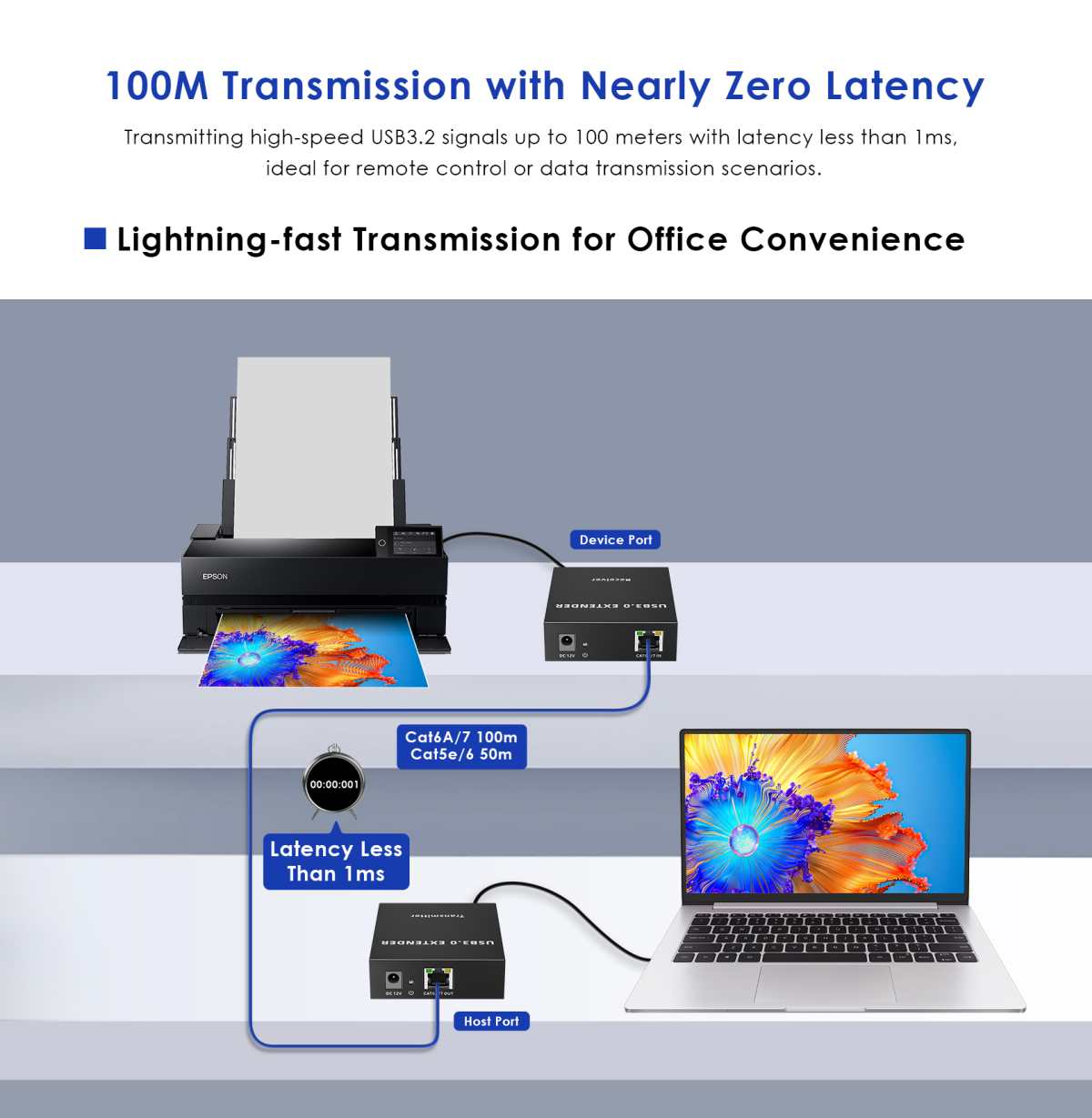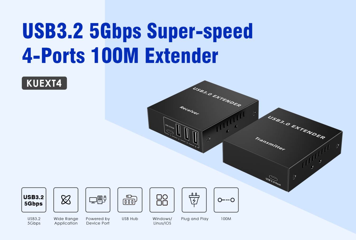 - Vysílá USB signál přes Cat5e/Cat6/Cat6A kabely až na vzdálenost 100m.