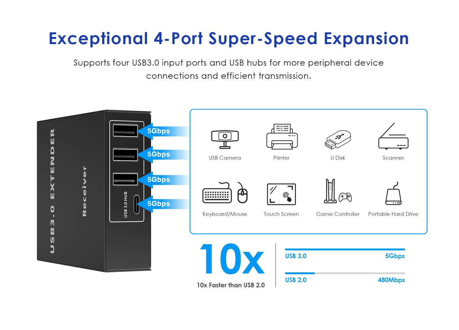 - Podporuje připojení až 4 USB zařízení na vzdálené straně extenderu.
